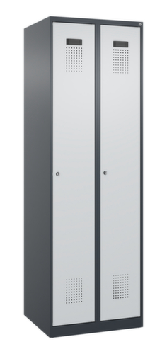 de belangrijkste maten van de C+P garderobekast Evolo PLUS in één oogopslag:per vak een gelaste hoedenplank en daaronder twee kledingstangen met elk 2 niet-verdraaibare dubbele schuifhaken. Het vak wordt onder de hoedenplank opgedeeld door een scheidingswand. Dit maakt een optimale scheiding tussen werk- en vrijetijdskleding mogelijk. De openslaande deuren kunnen met de handige etiketvensters heel eenvoudig worden gepersonaliseerd. Dankzij de design-perforatie, die voor een belangrijk deel aan de ventilatie bijdraagt, houdt de kast toch een strakke look en is deze hygiënisch en gemakkelijk te reinigen. Door de binnenliggende penscharnieren zien de inliggende deuren er strak uit, want aan de buitenkant zijn geen schroeven of scharnieren zichtbaar. Dus de scharnieren doen geen afbreuk aan het design waardoor de hele kast er hoogwaardiger uitziet. Bovendien is het gladde oppervlak gemakkelijker te reinigen, zonder moeilijk bereikbare plaatsen waar vuil of stof zich kan ophopen. Elke deur is standaard uitgerust met een systeem voor gedempte sluiting , zodat de deur niet dichtslaat, zelfs niet wanneer deze een krachtige duw krijgt. Dit draagt niet alleen bij aan een rustigere werkomgeving, maar beschermt de stalen kast ook tegen beschadiging. Geïnspireerd door de natuur levert het BIONIC Steel Frame een bijzonder efficiënte en stabiele constructie op. De torsiestijfheid neemt verder toe door een ingenieuze structuur aan de binnenkant met plooien, steunen en tussenruimten, en door materiaalversterking op belangrijke punten, zoals aan de voorkant van de zijwanden en in de scheidingswand en kokerprofielen. afsluitbaar met cilinderslot. Dankzij het uitgekiende concept van natuurlijke ventilatie is een constructief geoptimaliseerde luchtcirculatie mogelijk. Aangebrachte ventilerende vrije ruimtes voor en achter het legbord en ventilatieopeningen in bodem en dak dragen in combinatie met de perforatie in de deur bij aan een aangename luchtstroming. . Dit zorgt voor voldoende ventilatie in de kast waardoor de inhoud sneller droogt zonder onaangename geurtjes. De kast staat direct op de vloer, zonder sokkel of poten, voor een compacte en ruimtebesparende look. Alleen stelschroeven zorgen voor een stabiele stand als de vloer eventueel ongelijk is. De bodem van de kast is tevens verzinkt voor een betere bescherming tegen corrosie. constructie van staal, stevig gelast. Dit maakt de constructie zeer robuust en sterk en dus duurzamer. Omdat de hoeken en randen van de romp gelast zijn, is de kast goed afgedicht en dus beter beschermd tegen stof, vocht en vuil dan bij een schroefconstructie. Bovendien is regelmatig onderhoud en nastellen niet nodig. romp met moffellak in RAL7016 antracietgrijs, front met moffellak in RAL7035 lichtgrijs.