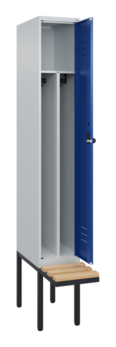 de belangrijkste maten van de C+P garderobekast Classic Plus in één oogopslag:per vak hoedenplank, kledingstang, haak. Het vak wordt onder de hoedenplank opgedeeld door een scheidingswand. Dit maakt een optimale scheiding tussen werk- en vrijetijdskleding mogelijk. openslaande deur met etikettenlijst en ventilatiesleuven. Door de binnenliggende penscharnieren zien de inliggende deuren er strak uit, want aan de buitenkant zijn geen schroeven of scharnieren zichtbaar. Dus de scharnieren doen geen afbreuk aan het design waardoor de hele kast er hoogwaardiger uitziet. Bovendien is het gladde oppervlak gemakkelijker te reinigen, zonder moeilijk bereikbare plaatsen waar vuil of stof zich kan ophopen. Elke deur is standaard uitgerust met een systeem voor gedempte sluiting , zodat de deur niet dichtslaat, zelfs niet wanneer deze een krachtige duw krijgt. Dit draagt niet alleen bij aan een rustigere werkomgeving, maar beschermt de stalen kast ook tegen beschadiging. Geïnspireerd door de natuur levert het BIONIC Steel Frame een bijzonder efficiënte en stabiele constructie op. De torsiestijfheid neemt verder toe door een ingenieuze structuur aan de binnenkant met plooien, steunen en tussenruimten, en door materiaalversterking op belangrijke punten, zoals aan de voorkant van de zijwanden en in de scheidingswand en kokerprofielen. Afsluitbaar met Veiligheidsdraaigrendel voor hangslot. Het veiligheidsslot is uitermate goed bestand tegen inbraak, omdat het doordraait wanneer het is vergrendeld en pas grijpt wanneer het slot is verwijderd. Passend voor alle hangsloten met een beugeldikte van 6 - 8 mm. De extra ventilatieopeningen in het vak, in combinatie met de ventilatiesleuven in de deur, verbeteren de luchtstroom. Dit zorgt voor een goede ventilatie in de kast waardoor de inhoud sneller droogt zonder onaangename geurtjes. voorgebouwde bank. De randen zijn van beukenhout. constructie van staal, stevig gelast. Dit maakt de constructie zeer robuust en sterk en dus duurzamer. Omdat de hoeken en randen van de romp gelast zijn, is de kast goed afgedicht en dus beter beschermd tegen stof, vocht en vuil dan bij een schroefconstructie. Bovendien is regelmatig onderhoud en nastellen niet nodig. romp met moffellak in RAL7035 lichtgrijs, front met moffellak in RAL5010 gentiaanblauw.