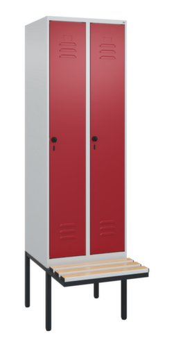 de belangrijkste maten van de C+P garderobekast Classic Plus in één oogopslag:per vak hoedenplank, kledingstang, haak. Het vak wordt onder de hoedenplank opgedeeld door een scheidingswand. Dit maakt een optimale scheiding tussen werk- en vrijetijdskleding mogelijk. openslaande deur met etikettenlijst en ventilatiesleuven. Door de binnenliggende penscharnieren zien de inliggende deuren er strak uit, want aan de buitenkant zijn geen schroeven of scharnieren zichtbaar. Dus de scharnieren doen geen afbreuk aan het design waardoor de hele kast er hoogwaardiger uitziet. Bovendien is het gladde oppervlak gemakkelijker te reinigen, zonder moeilijk bereikbare plaatsen waar vuil of stof zich kan ophopen. Elke deur is standaard uitgerust met een systeem voor gedempte sluiting , zodat de deur niet dichtslaat, zelfs niet wanneer deze een krachtige duw krijgt. Dit draagt niet alleen bij aan een rustigere werkomgeving, maar beschermt de stalen kast ook tegen beschadiging. Geïnspireerd door de natuur levert het BIONIC Steel Frame een bijzonder efficiënte en stabiele constructie op. De torsiestijfheid neemt verder toe door een ingenieuze structuur aan de binnenkant met plooien, steunen en tussenruimten, en door materiaalversterking op belangrijke punten, zoals aan de voorkant van de zijwanden en in de scheidingswand en kokerprofielen. Afsluitbaar met Veiligheidsdraaigrendel voor hangslot. Het veiligheidsslot is uitermate goed bestand tegen inbraak, omdat het doordraait wanneer het is vergrendeld en pas grijpt wanneer het slot is verwijderd. Passend voor alle hangsloten met een beugeldikte van 6 - 8 mm. De extra ventilatieopeningen in het vak, in combinatie met de ventilatiesleuven in de deur, verbeteren de luchtstroom. Dit zorgt voor een goede ventilatie in de kast waardoor de inhoud sneller droogt zonder onaangename geurtjes. voorgebouwde bank. De randen zijn van kunststof. constructie van staal, stevig gelast. Dit maakt de constructie zeer robuust en sterk en dus duurzamer. Omdat de hoeken en randen van de romp gelast zijn, is de kast goed afgedicht en dus beter beschermd tegen stof, vocht en vuil dan bij een schroefconstructie. Bovendien is regelmatig onderhoud en nastellen niet nodig. romp met moffellak in RAL7035 lichtgrijs, front met moffellak in RAL3003 robijnrood.