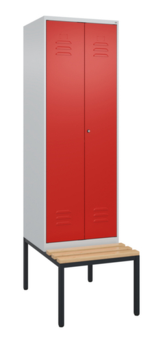 de belangrijkste maten van de C+P garderobekast Classic Plus in één oogopslag:per vak een vastgelaste hoedenplank en een kledingstang eronder met 3 niet verdraaibare, dubbele schuifhaken. dubbele openslaande deur met ventilatiesleuven en etikettenlijsten. Door de binnenliggende penscharnieren zien de inliggende deuren er strak uit, want aan de buitenkant zijn geen schroeven of scharnieren zichtbaar. Dus de scharnieren doen geen afbreuk aan het design waardoor de hele kast er hoogwaardiger uitziet. Bovendien is het gladde oppervlak gemakkelijker te reinigen, zonder moeilijk bereikbare plaatsen waar vuil of stof zich kan ophopen. Elke deur is standaard uitgerust met een systeem voor gedempte sluiting , zodat de deur niet dichtslaat, zelfs niet wanneer deze een krachtige duw krijgt. Dit draagt niet alleen bij aan een rustigere werkomgeving, maar beschermt de stalen kast ook tegen beschadiging. Geïnspireerd door de natuur levert het BIONIC Steel Frame een bijzonder efficiënte en stabiele constructie op. De torsiestijfheid neemt verder toe door een ingenieuze structuur aan de binnenkant met plooien, steunen en tussenruimten, en door materiaalversterking op belangrijke punten, zoals aan de voorkant van de zijwanden en in de scheidingswand en kokerprofielen. afsluitbaar met cilinderslot. Er zijn 2 vakken beschikbaar per persoon, die kunnen worden afgesloten met naar elkaar dichtslaande deuren. Dit maakt het gemakkelijk om werk- en vrijetijdskleding strikt en netjes gescheiden te houden. De extra ventilatieopeningen in het vak, in combinatie met de ventilatiesleuven in de deur, verbeteren de luchtstroom. Dit zorgt voor een goede ventilatie in de kast waardoor de inhoud sneller droogt zonder onaangename geurtjes. De geïntegreerde bank zorgt voor een efficiënt gebruik van de beschikbare ruimte. Dit maakt aan- en uitkleden gemakkelijk en biedt opbergruimte onder de kast zonder extra ruimte in beslag te nemen. De randen zijn van beukenhout. constructie van staal, stevig gelast. Dit maakt de constructie zeer robuust en sterk en dus duurzamer. Omdat de hoeken en randen van de romp gelast zijn, is de kast goed afgedicht en dus beter beschermd tegen stof, vocht en vuil dan bij een schroefconstructie. Bovendien is regelmatig onderhoud en nastellen niet nodig. romp met moffellak in RAL7035 lichtgrijs, front met moffellak in RAL3020 verkeersrood.
