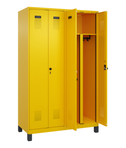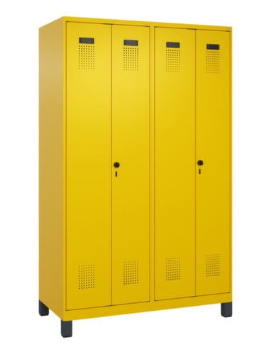 . de belangrijkste maten van de C+P garderobekast Evolo PLUS in één oogopslag:per vak 1 stevige garderobestang met ovaal profiel en 3 niet verdraaiende dubbele schuifhaken, daarboven een doorlopende hoedenplank met de breedte van 2 vakken. Deze extra brede plank is ideaal voor het opbergen van PBM-uitrusting zoals helmen, gezichts- of gehoorbescherming. De dubbele openslaande deuren kunnen met de handige etiketvensters heel eenvoudig worden gepersonaliseerd. Dankzij de design-perforatie, die voor een belangrijk deel aan de ventilatie bijdraagt, houdt de kast toch een strakke look en is hij hygiënisch en gemakkelijk te reinigen. Door de binnenliggende penscharnieren zien de inliggende deuren er strak uit, want aan de buitenkant zijn geen schroeven of scharnieren zichtbaar. Dus de scharnieren doen geen afbreuk aan het design waardoor de hele kast er hoogwaardiger uitziet. Bovendien is het gladde oppervlak gemakkelijker te reinigen, zonder moeilijk bereikbare plaatsen waar vuil of stof zich kan ophopen. Elke deur is standaard uitgerust met een systeem voor gedempte sluiting , zodat de deur niet dichtslaat, zelfs niet wanneer deze een krachtige duw krijgt. Dit draagt niet alleen bij aan een rustigere werkomgeving, maar beschermt de stalen kast ook tegen beschadiging. Geïnspireerd door de natuur levert het BIONIC Steel Frame een bijzonder efficiënte en stabiele constructie op. De torsiestijfheid neemt verder toe door een ingenieuze structuur aan de binnenkant met plooien, steunen en tussenruimten, en door materiaalversterking op belangrijke punten, zoals aan de voorkant van de zijwanden en in de scheidingswand en kokerprofielen. Er zijn 2 vakken beschikbaar per persoon, die kunnen worden afgesloten met naar elkaar dichtslaande deuren. Dit maakt het gemakkelijk om werk- en vrijetijdskleding strikt en netjes gescheiden te houden. Dankzij het uitgekiende concept van natuurlijke ventilatie is een constructief geoptimaliseerde luchtcirculatie mogelijk. Aangebrachte ventilerende vrije ruimtes voor en achter het legbord en ventilatieopeningen in bodem en dak dragen in combinatie met de perforatie in de deur bij aan een aangename luchtstroming. . Dit zorgt voor voldoende ventilatie in de kast waardoor de inhoud sneller droogt zonder onaangename geurtjes. Door de kunststof voeten onder de kast ziet de kast er niet alleen modern en minder massief uit, maar de voeten bieden ook praktische voordelen. De ruimte onder de kast is gemakkelijker schoon te maken en het kunststof van de voeten biedt een betere bescherming tegen corrosie. Vooral in omgevingen waar hogere eisen aan de hygiëne worden gesteld, is dit een belangrijk aspect. constructie van staal, stevig gelast. Dit maakt de constructie zeer robuust en sterk en dus duurzamer. Omdat de hoeken en randen van de romp gelast zijn, is de kast goed afgedicht en dus beter beschermd tegen stof, vocht en vuil dan bij een schroefconstructie. Bovendien is regelmatig onderhoud en nastellen niet nodig. romp met moffellak in RAL1023 verkeersgeel, front met moffellak in RAL1023 verkeersgeel.