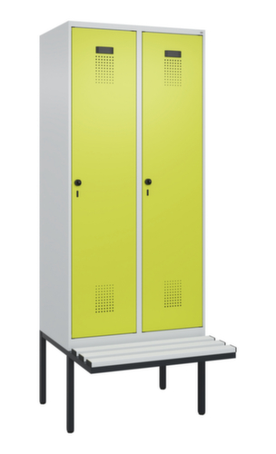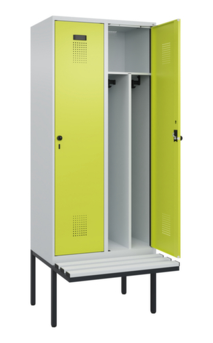 de belangrijkste maten van de C+P garderobekast Evolo PLUS in één oogopslag:per vak een gelaste hoedenplank en daaronder twee kledingstangen met elk 2 niet-verdraaibare dubbele schuifhaken. Het vak wordt onder de hoedenplank opgedeeld door een scheidingswand. Dit maakt een optimale scheiding tussen werk- en vrijetijdskleding mogelijk. De openslaande deuren kunnen met de handige etiketvensters heel eenvoudig worden gepersonaliseerd. Dankzij de design-perforatie, die voor een belangrijk deel aan de ventilatie bijdraagt, houdt de kast toch een strakke look en is deze hygiënisch en gemakkelijk te reinigen. Door de binnenliggende penscharnieren zien de inliggende deuren er strak uit, want aan de buitenkant zijn geen schroeven of scharnieren zichtbaar. Dus de scharnieren doen geen afbreuk aan het design waardoor de hele kast er hoogwaardiger uitziet. Bovendien is het gladde oppervlak gemakkelijker te reinigen, zonder moeilijk bereikbare plaatsen waar vuil of stof zich kan ophopen. Elke deur is standaard uitgerust met een systeem voor gedempte sluiting , zodat de deur niet dichtslaat, zelfs niet wanneer deze een krachtige duw krijgt. Dit draagt niet alleen bij aan een rustigere werkomgeving, maar beschermt de stalen kast ook tegen beschadiging. Geïnspireerd door de natuur levert het BIONIC Steel Frame een bijzonder efficiënte en stabiele constructie op. De torsiestijfheid neemt verder toe door een ingenieuze structuur aan de binnenkant met plooien, steunen en tussenruimten, en door materiaalversterking op belangrijke punten, zoals aan de voorkant van de zijwanden en in de scheidingswand en kokerprofielen. Dankzij het uitgekiende concept van natuurlijke ventilatie is een constructief geoptimaliseerde luchtcirculatie mogelijk. Aangebrachte ventilerende vrije ruimtes voor en achter het legbord en ventilatieopeningen in bodem en dak dragen in combinatie met de perforatie in de deur bij aan een aangename luchtstroming. . Dit zorgt voor voldoende ventilatie in de kast waardoor de inhoud sneller droogt zonder onaangename geurtjes. De zwevende bank biedt meer ruimte voor comfortabel aan- en uitkleden, zonder dat de voeten van het onderstel in de weg zitten. De randen zijn van Kunststof met stalen kern - hygiënische, onderhoudsvriendelijke en tegelijk uiterst stabiele zitting. Door de hoge belastbaarheid en duurzaamheid bij uitstek geschikt voor plekken waar mensen zich vaak moeten omkleden. Het ondergebouwde voetonderstel vermindert mogelijke ophoping van vuil en stof, omdat het gemakkelijker is om alle oppervlakken volledig te reinigen. Bovendien ontstaat hierdoor extra opbergruimte onder de kast. Schoenen en tassen staan niet meer in de weg, het risico op struikelen wordt kleiner. constructie van staal, stevig gelast. Dit maakt de constructie zeer robuust en sterk en dus duurzamer. Omdat de hoeken en randen van de romp gelast zijn, is de kast goed afgedicht en dus beter beschermd tegen stof, vocht en vuil dan bij een schroefconstructie. Bovendien is regelmatig onderhoud en nastellen niet nodig. romp met moffellak in RAL7035 lichtgrijs, front met moffellak in RAL 1108060 Clowngroen.