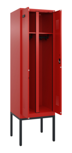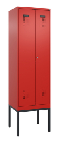 de belangrijkste maten van de C+P garderobekast Evolo PLUS in één oogopslag:per vak een vastgelaste hoedenplank en een kledingstang eronder met 3 niet verdraaibare, dubbele schuifhaken. De dubbele openslaande deuren kunnen met de handige etiketvensters heel eenvoudig worden gepersonaliseerd. Dankzij de design-perforatie, die voor een belangrijk deel aan de ventilatie bijdraagt, houdt de kast toch een strakke look en is hij hygiënisch en gemakkelijk te reinigen. Door de binnenliggende penscharnieren zien de inliggende deuren er strak uit, want aan de buitenkant zijn geen schroeven of scharnieren zichtbaar. Dus de scharnieren doen geen afbreuk aan het design waardoor de hele kast er hoogwaardiger uitziet. Bovendien is het gladde oppervlak gemakkelijker te reinigen, zonder moeilijk bereikbare plaatsen waar vuil of stof zich kan ophopen. Elke deur is standaard uitgerust met een systeem voor gedempte sluiting , zodat de deur niet dichtslaat, zelfs niet wanneer deze een krachtige duw krijgt. Dit draagt niet alleen bij aan een rustigere werkomgeving, maar beschermt de stalen kast ook tegen beschadiging. Geïnspireerd door de natuur levert het BIONIC Steel Frame een bijzonder efficiënte en stabiele constructie op. De torsiestijfheid neemt verder toe door een ingenieuze structuur aan de binnenkant met plooien, steunen en tussenruimten, en door materiaalversterking op belangrijke punten, zoals aan de voorkant van de zijwanden en in de scheidingswand en kokerprofielen. afsluitbaar met cilinderslot. Er zijn 2 vakken beschikbaar per persoon, die kunnen worden afgesloten met naar elkaar dichtslaande deuren. Dit maakt het gemakkelijk om werk- en vrijetijdskleding strikt en netjes gescheiden te houden. Dankzij het uitgekiende concept van natuurlijke ventilatie is een constructief geoptimaliseerde luchtcirculatie mogelijk. Aangebrachte ventilerende vrije ruimtes voor en achter het legbord en ventilatieopeningen in bodem en dak dragen in combinatie met de perforatie in de deur bij aan een aangename luchtstroming. . Dit zorgt voor voldoende ventilatie in de kast waardoor de inhoud sneller droogt zonder onaangename geurtjes. Het ondergebouwde voetonderstel vermindert mogelijke ophoping van vuil en stof, omdat het gemakkelijker is om alle oppervlakken volledig te reinigen. Bovendien ontstaat hierdoor extra opbergruimte onder de kast. Schoenen en tassen staan niet meer in de weg, het risico op struikelen wordt kleiner. constructie van staal, stevig gelast. Dit maakt de constructie zeer robuust en sterk en dus duurzamer. Omdat de hoeken en randen van de romp gelast zijn, is de kast goed afgedicht en dus beter beschermd tegen stof, vocht en vuil dan bij een schroefconstructie. Bovendien is regelmatig onderhoud en nastellen niet nodig. romp met moffellak in RAL3020 verkeersrood, front met moffellak in RAL3020 verkeersrood.