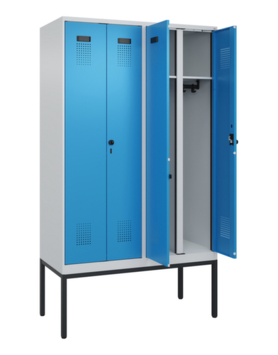 de belangrijkste maten van de C+P garderobekast Evolo PLUS in één oogopslag:per vak een vastgelaste hoedenplank en een kledingstang eronder met 3 niet verdraaibare, dubbele schuifhaken. De dubbele openslaande deuren kunnen met de handige etiketvensters heel eenvoudig worden gepersonaliseerd. Dankzij de design-perforatie, die voor een belangrijk deel aan de ventilatie bijdraagt, houdt de kast toch een strakke look en is hij hygiënisch en gemakkelijk te reinigen. Door de binnenliggende penscharnieren zien de inliggende deuren er strak uit, want aan de buitenkant zijn geen schroeven of scharnieren zichtbaar. Dus de scharnieren doen geen afbreuk aan het design waardoor de hele kast er hoogwaardiger uitziet. Bovendien is het gladde oppervlak gemakkelijker te reinigen, zonder moeilijk bereikbare plaatsen waar vuil of stof zich kan ophopen. Elke deur is standaard uitgerust met een systeem voor gedempte sluiting , zodat de deur niet dichtslaat, zelfs niet wanneer deze een krachtige duw krijgt. Dit draagt niet alleen bij aan een rustigere werkomgeving, maar beschermt de stalen kast ook tegen beschadiging. Geïnspireerd door de natuur levert het BIONIC Steel Frame een bijzonder efficiënte en stabiele constructie op. De torsiestijfheid neemt verder toe door een ingenieuze structuur aan de binnenkant met plooien, steunen en tussenruimten, en door materiaalversterking op belangrijke punten, zoals aan de voorkant van de zijwanden en in de scheidingswand en kokerprofielen. Er zijn 2 vakken beschikbaar per persoon, die kunnen worden afgesloten met naar elkaar dichtslaande deuren. Dit maakt het gemakkelijk om werk- en vrijetijdskleding strikt en netjes gescheiden te houden. Dankzij het uitgekiende concept van natuurlijke ventilatie is een constructief geoptimaliseerde luchtcirculatie mogelijk. Aangebrachte ventilerende vrije ruimtes voor en achter het legbord en ventilatieopeningen in bodem en dak dragen in combinatie met de perforatie in de deur bij aan een aangename luchtstroming. . Dit zorgt voor voldoende ventilatie in de kast waardoor de inhoud sneller droogt zonder onaangename geurtjes. Het ondergebouwde voetonderstel vermindert mogelijke ophoping van vuil en stof, omdat het gemakkelijker is om alle oppervlakken volledig te reinigen. Bovendien ontstaat hierdoor extra opbergruimte onder de kast. Schoenen en tassen staan niet meer in de weg, het risico op struikelen wordt kleiner. constructie van staal, stevig gelast. Dit maakt de constructie zeer robuust en sterk en dus duurzamer. Omdat de hoeken en randen van de romp gelast zijn, is de kast goed afgedicht en dus beter beschermd tegen stof, vocht en vuil dan bij een schroefconstructie. Bovendien is regelmatig onderhoud en nastellen niet nodig. romp met moffellak in RAL7035 lichtgrijs, front met moffellak in RAL 5012 lichtblauw.