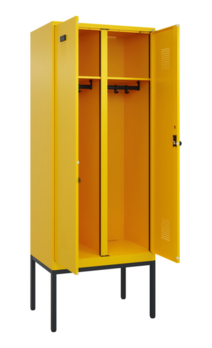de belangrijkste maten van de C+P garderobekast Evolo PLUS in één oogopslag:per vak een vastgelaste hoedenplank en een kledingstang eronder met 3 niet verdraaibare, dubbele schuifhaken. De dubbele openslaande deuren kunnen met de handige etiketvensters heel eenvoudig worden gepersonaliseerd. Dankzij de design-perforatie, die voor een belangrijk deel aan de ventilatie bijdraagt, houdt de kast toch een strakke look en is hij hygiënisch en gemakkelijk te reinigen. Door de binnenliggende penscharnieren zien de inliggende deuren er strak uit, want aan de buitenkant zijn geen schroeven of scharnieren zichtbaar. Dus de scharnieren doen geen afbreuk aan het design waardoor de hele kast er hoogwaardiger uitziet. Bovendien is het gladde oppervlak gemakkelijker te reinigen, zonder moeilijk bereikbare plaatsen waar vuil of stof zich kan ophopen. Elke deur is standaard uitgerust met een systeem voor gedempte sluiting , zodat de deur niet dichtslaat, zelfs niet wanneer deze een krachtige duw krijgt. Dit draagt niet alleen bij aan een rustigere werkomgeving, maar beschermt de stalen kast ook tegen beschadiging. Geïnspireerd door de natuur levert het BIONIC Steel Frame een bijzonder efficiënte en stabiele constructie op. De torsiestijfheid neemt verder toe door een ingenieuze structuur aan de binnenkant met plooien, steunen en tussenruimten, en door materiaalversterking op belangrijke punten, zoals aan de voorkant van de zijwanden en in de scheidingswand en kokerprofielen. Er zijn 2 vakken beschikbaar per persoon, die kunnen worden afgesloten met naar elkaar dichtslaande deuren. Dit maakt het gemakkelijk om werk- en vrijetijdskleding strikt en netjes gescheiden te houden. Dankzij het uitgekiende concept van natuurlijke ventilatie is een constructief geoptimaliseerde luchtcirculatie mogelijk. Aangebrachte ventilerende vrije ruimtes voor en achter het legbord en ventilatieopeningen in bodem en dak dragen in combinatie met de perforatie in de deur bij aan een aangename luchtstroming. . Dit zorgt voor voldoende ventilatie in de kast waardoor de inhoud sneller droogt zonder onaangename geurtjes. Het ondergebouwde voetonderstel vermindert mogelijke ophoping van vuil en stof, omdat het gemakkelijker is om alle oppervlakken volledig te reinigen. Bovendien ontstaat hierdoor extra opbergruimte onder de kast. Schoenen en tassen staan niet meer in de weg, het risico op struikelen wordt kleiner. constructie van staal, stevig gelast. Dit maakt de constructie zeer robuust en sterk en dus duurzamer. Omdat de hoeken en randen van de romp gelast zijn, is de kast goed afgedicht en dus beter beschermd tegen stof, vocht en vuil dan bij een schroefconstructie. Bovendien is regelmatig onderhoud en nastellen niet nodig. romp met moffellak in RAL1023 verkeersgeel, front met moffellak in RAL1023 verkeersgeel.