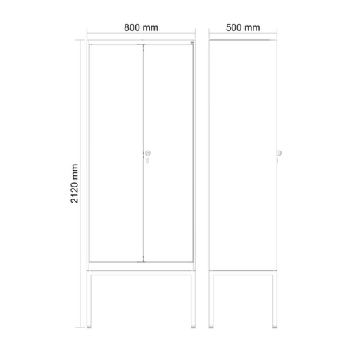 de belangrijkste maten van de C+P garderobekast Evolo PLUS in één oogopslag:per vak een vastgelaste hoedenplank en een kledingstang eronder met 3 niet verdraaibare, dubbele schuifhaken. De dubbele openslaande deuren kunnen met de handige etiketvensters heel eenvoudig worden gepersonaliseerd. Dankzij de design-perforatie, die voor een belangrijk deel aan de ventilatie bijdraagt, houdt de kast toch een strakke look en is hij hygiënisch en gemakkelijk te reinigen. Door de binnenliggende penscharnieren zien de inliggende deuren er strak uit, want aan de buitenkant zijn geen schroeven of scharnieren zichtbaar. Dus de scharnieren doen geen afbreuk aan het design waardoor de hele kast er hoogwaardiger uitziet. Bovendien is het gladde oppervlak gemakkelijker te reinigen, zonder moeilijk bereikbare plaatsen waar vuil of stof zich kan ophopen. Elke deur is standaard uitgerust met een systeem voor gedempte sluiting , zodat de deur niet dichtslaat, zelfs niet wanneer deze een krachtige duw krijgt. Dit draagt niet alleen bij aan een rustigere werkomgeving, maar beschermt de stalen kast ook tegen beschadiging. Geïnspireerd door de natuur levert het BIONIC Steel Frame een bijzonder efficiënte en stabiele constructie op. De torsiestijfheid neemt verder toe door een ingenieuze structuur aan de binnenkant met plooien, steunen en tussenruimten, en door materiaalversterking op belangrijke punten, zoals aan de voorkant van de zijwanden en in de scheidingswand en kokerprofielen. afsluitbaar met cilinderslot. Er zijn 2 vakken beschikbaar per persoon, die kunnen worden afgesloten met naar elkaar dichtslaande deuren. Dit maakt het gemakkelijk om werk- en vrijetijdskleding strikt en netjes gescheiden te houden. Dankzij het uitgekiende concept van natuurlijke ventilatie is een constructief geoptimaliseerde luchtcirculatie mogelijk. Aangebrachte ventilerende vrije ruimtes voor en achter het legbord en ventilatieopeningen in bodem en dak dragen in combinatie met de perforatie in de deur bij aan een aangename luchtstroming. . Dit zorgt voor voldoende ventilatie in de kast waardoor de inhoud sneller droogt zonder onaangename geurtjes. Het ondergebouwde voetonderstel vermindert mogelijke ophoping van vuil en stof, omdat het gemakkelijker is om alle oppervlakken volledig te reinigen. Bovendien ontstaat hierdoor extra opbergruimte onder de kast. Schoenen en tassen staan niet meer in de weg, het risico op struikelen wordt kleiner. constructie van staal, stevig gelast. Dit maakt de constructie zeer robuust en sterk en dus duurzamer. Omdat de hoeken en randen van de romp gelast zijn, is de kast goed afgedicht en dus beter beschermd tegen stof, vocht en vuil dan bij een schroefconstructie. Bovendien is regelmatig onderhoud en nastellen niet nodig. romp met moffellak in RAL7035 lichtgrijs, front met moffellak in RAL 5012 lichtblauw.