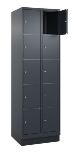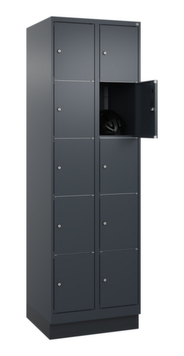 de belangrijkste maten van het C+P lockersysteem Classic Plus in één oogopslag:romp met eenvoudige openslaande deur. Door de binnenliggende penscharnieren zien de inliggende deuren er strak uit, want aan de buitenkant zijn geen schroeven of scharnieren zichtbaar. Dus de scharnieren doen geen afbreuk aan het design waardoor de hele kast er hoogwaardiger uitziet. Bovendien is het gladde oppervlak gemakkelijker te reinigen, zonder moeilijk bereikbare plaatsen waar vuil of stof zich kan ophopen. Elke deur is standaard uitgerust met een systeem voor gedempte sluiting , zodat de deur niet dichtslaat, zelfs niet wanneer deze een krachtige duw krijgt. Dit draagt niet alleen bij aan een rustigere werkomgeving, maar beschermt de stalen kast ook tegen beschadiging. Geïnspireerd door de natuur levert het BIONIC Steel Frame een bijzonder efficiënte en stabiele constructie op. De torsiestijfheid neemt verder toe door een ingenieuze structuur aan de binnenkant met plooien, steunen en tussenruimten, en door materiaalversterking op belangrijke punten, zoals aan de voorkant van de zijwanden en in de scheidingswand en kokerprofielen. afsluitbaar met cilinderslot. De sokkel onder de kast zorgt ervoor dat het gewicht van de kast gelijkmatig over de vloer wordt verdeeld. Hierdoor staat de kast stabieler en kan hij zwaardere lasten dragen dan een kast met voeten. En omdat er geen vuil, stof en vocht onder kan komen, hoeft er onder de kast niet te worden schoongemaakt. constructie van staal, stevig gelast. Dit maakt de constructie zeer robuust en sterk en dus duurzamer. Omdat de hoeken en randen van de romp gelast zijn, is de kast goed afgedicht en dus beter beschermd tegen stof, vocht en vuil dan bij een schroefconstructie. Bovendien is regelmatig onderhoud en nastellen niet nodig. romp met moffellak in RAL7016 antracietgrijs. front met moffellak in RAL7016 antracietgrijs.