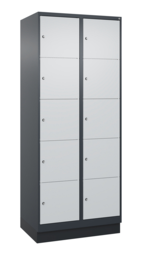 de belangrijkste maten van het C+P lockersysteem Classic Plus in één oogopslag:romp met eenvoudige openslaande deur. Door de binnenliggende penscharnieren zien de inliggende deuren er strak uit, want aan de buitenkant zijn geen schroeven of scharnieren zichtbaar. Dus de scharnieren doen geen afbreuk aan het design waardoor de hele kast er hoogwaardiger uitziet. Bovendien is het gladde oppervlak gemakkelijker te reinigen, zonder moeilijk bereikbare plaatsen waar vuil of stof zich kan ophopen. Elke deur is standaard uitgerust met een systeem voor gedempte sluiting , zodat de deur niet dichtslaat, zelfs niet wanneer deze een krachtige duw krijgt. Dit draagt niet alleen bij aan een rustigere werkomgeving, maar beschermt de stalen kast ook tegen beschadiging. Geïnspireerd door de natuur levert het BIONIC Steel Frame een bijzonder efficiënte en stabiele constructie op. De torsiestijfheid neemt verder toe door een ingenieuze structuur aan de binnenkant met plooien, steunen en tussenruimten, en door materiaalversterking op belangrijke punten, zoals aan de voorkant van de zijwanden en in de scheidingswand en kokerprofielen. afsluitbaar met cilinderslot. De sokkel onder de kast zorgt ervoor dat het gewicht van de kast gelijkmatig over de vloer wordt verdeeld. Hierdoor staat de kast stabieler en kan hij zwaardere lasten dragen dan een kast met voeten. En omdat er geen vuil, stof en vocht onder kan komen, hoeft er onder de kast niet te worden schoongemaakt. constructie van staal, stevig gelast. Dit maakt de constructie zeer robuust en sterk en dus duurzamer. Omdat de hoeken en randen van de romp gelast zijn, is de kast goed afgedicht en dus beter beschermd tegen stof, vocht en vuil dan bij een schroefconstructie. Bovendien is regelmatig onderhoud en nastellen niet nodig. romp met moffellak in RAL7016 antracietgrijs. front met moffellak in RAL7035 lichtgrijs.