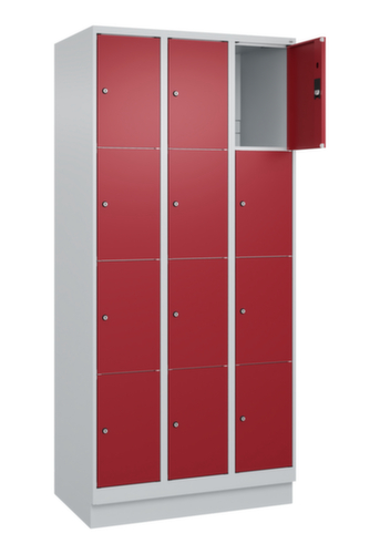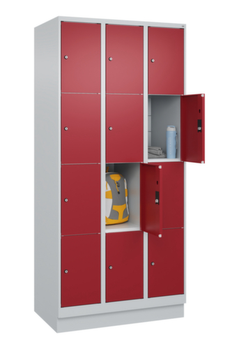 de belangrijkste maten van het C+P lockersysteem Classic Plus in één oogopslag:romp met eenvoudige openslaande deur. Door de binnenliggende penscharnieren zien de inliggende deuren er strak uit, want aan de buitenkant zijn geen schroeven of scharnieren zichtbaar. Dus de scharnieren doen geen afbreuk aan het design waardoor de hele kast er hoogwaardiger uitziet. Bovendien is het gladde oppervlak gemakkelijker te reinigen, zonder moeilijk bereikbare plaatsen waar vuil of stof zich kan ophopen. Elke deur is standaard uitgerust met een systeem voor gedempte sluiting , zodat de deur niet dichtslaat, zelfs niet wanneer deze een krachtige duw krijgt. Dit draagt niet alleen bij aan een rustigere werkomgeving, maar beschermt de stalen kast ook tegen beschadiging. Geïnspireerd door de natuur levert het BIONIC Steel Frame een bijzonder efficiënte en stabiele constructie op. De torsiestijfheid neemt verder toe door een ingenieuze structuur aan de binnenkant met plooien, steunen en tussenruimten, en door materiaalversterking op belangrijke punten, zoals aan de voorkant van de zijwanden en in de scheidingswand en kokerprofielen. afsluitbaar met cilinderslot. De sokkel onder de kast zorgt ervoor dat het gewicht van de kast gelijkmatig over de vloer wordt verdeeld. Hierdoor staat de kast stabieler en kan hij zwaardere lasten dragen dan een kast met voeten. En omdat er geen vuil, stof en vocht onder kan komen, hoeft er onder de kast niet te worden schoongemaakt. constructie van staal, stevig gelast. Dit maakt de constructie zeer robuust en sterk en dus duurzamer. Omdat de hoeken en randen van de romp gelast zijn, is de kast goed afgedicht en dus beter beschermd tegen stof, vocht en vuil dan bij een schroefconstructie. Bovendien is regelmatig onderhoud en nastellen niet nodig. romp met moffellak in RAL7035 lichtgrijs. front met moffellak in RAL3003 robijnrood.
