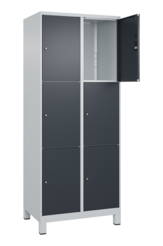 de belangrijkste maten van het C+P lockersysteem Classic Plus in één oogopslag:romp met eenvoudige openslaande deur. Door de binnenliggende penscharnieren zien de inliggende deuren er strak uit, want aan de buitenkant zijn geen schroeven of scharnieren zichtbaar. Dus de scharnieren doen geen afbreuk aan het design waardoor de hele kast er hoogwaardiger uitziet. Bovendien is het gladde oppervlak gemakkelijker te reinigen, zonder moeilijk bereikbare plaatsen waar vuil of stof zich kan ophopen. Elke deur is standaard uitgerust met een systeem voor gedempte sluiting , zodat de deur niet dichtslaat, zelfs niet wanneer deze een krachtige duw krijgt. Dit draagt niet alleen bij aan een rustigere werkomgeving, maar beschermt de stalen kast ook tegen beschadiging. Geïnspireerd door de natuur levert het BIONIC Steel Frame een bijzonder efficiënte en stabiele constructie op. De torsiestijfheid neemt verder toe door een ingenieuze structuur aan de binnenkant met plooien, steunen en tussenruimten, en door materiaalversterking op belangrijke punten, zoals aan de voorkant van de zijwanden en in de scheidingswand en kokerprofielen. afsluitbaar met cilinderslot. Door de kunststof voeten onder de kast ziet de kast er niet alleen modern en minder massief uit, maar de voeten bieden ook praktische voordelen. De ruimte onder de kast is gemakkelijker schoon te maken en het kunststof van de voeten biedt een betere bescherming tegen corrosie. Vooral in omgevingen waar hogere eisen aan de hygiëne worden gesteld, is dit een belangrijk aspect. constructie van staal, stevig gelast. Dit maakt de constructie zeer robuust en sterk en dus duurzamer. Omdat de hoeken en randen van de romp gelast zijn, is de kast goed afgedicht en dus beter beschermd tegen stof, vocht en vuil dan bij een schroefconstructie. Bovendien is regelmatig onderhoud en nastellen niet nodig. romp met moffellak in RAL7035 lichtgrijs. front met moffellak in RAL7016 antracietgrijs.