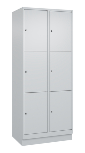 de belangrijkste maten van het C+P lockersysteem Classic Plus in één oogopslag:romp met eenvoudige openslaande deur. Door de binnenliggende penscharnieren zien de inliggende deuren er strak uit, want aan de buitenkant zijn geen schroeven of scharnieren zichtbaar. Dus de scharnieren doen geen afbreuk aan het design waardoor de hele kast er hoogwaardiger uitziet. Bovendien is het gladde oppervlak gemakkelijker te reinigen, zonder moeilijk bereikbare plaatsen waar vuil of stof zich kan ophopen. Elke deur is standaard uitgerust met een systeem voor gedempte sluiting , zodat de deur niet dichtslaat, zelfs niet wanneer deze een krachtige duw krijgt. Dit draagt niet alleen bij aan een rustigere werkomgeving, maar beschermt de stalen kast ook tegen beschadiging. Geïnspireerd door de natuur levert het BIONIC Steel Frame een bijzonder efficiënte en stabiele constructie op. De torsiestijfheid neemt verder toe door een ingenieuze structuur aan de binnenkant met plooien, steunen en tussenruimten, en door materiaalversterking op belangrijke punten, zoals aan de voorkant van de zijwanden en in de scheidingswand en kokerprofielen. afsluitbaar met cilinderslot. De sokkel onder de kast zorgt ervoor dat het gewicht van de kast gelijkmatig over de vloer wordt verdeeld. Hierdoor staat de kast stabieler en kan hij zwaardere lasten dragen dan een kast met voeten. En omdat er geen vuil, stof en vocht onder kan komen, hoeft er onder de kast niet te worden schoongemaakt. constructie van staal, stevig gelast. Dit maakt de constructie zeer robuust en sterk en dus duurzamer. Omdat de hoeken en randen van de romp gelast zijn, is de kast goed afgedicht en dus beter beschermd tegen stof, vocht en vuil dan bij een schroefconstructie. Bovendien is regelmatig onderhoud en nastellen niet nodig. romp met moffellak in RAL7035 lichtgrijs. front met moffellak in RAL7035 lichtgrijs.