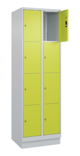 de belangrijkste maten van het C+P lockersysteem Classic Plus in één oogopslag:romp met eenvoudige openslaande deur. Door de binnenliggende penscharnieren zien de inliggende deuren er strak uit, want aan de buitenkant zijn geen schroeven of scharnieren zichtbaar. Dus de scharnieren doen geen afbreuk aan het design waardoor de hele kast er hoogwaardiger uitziet. Bovendien is het gladde oppervlak gemakkelijker te reinigen, zonder moeilijk bereikbare plaatsen waar vuil of stof zich kan ophopen. Elke deur is standaard uitgerust met een systeem voor gedempte sluiting , zodat de deur niet dichtslaat, zelfs niet wanneer deze een krachtige duw krijgt. Dit draagt niet alleen bij aan een rustigere werkomgeving, maar beschermt de stalen kast ook tegen beschadiging. Geïnspireerd door de natuur levert het BIONIC Steel Frame een bijzonder efficiënte en stabiele constructie op. De torsiestijfheid neemt verder toe door een ingenieuze structuur aan de binnenkant met plooien, steunen en tussenruimten, en door materiaalversterking op belangrijke punten, zoals aan de voorkant van de zijwanden en in de scheidingswand en kokerprofielen. afsluitbaar met cilinderslot. De sokkel onder de kast zorgt ervoor dat het gewicht van de kast gelijkmatig over de vloer wordt verdeeld. Hierdoor staat de kast stabieler en kan hij zwaardere lasten dragen dan een kast met voeten. En omdat er geen vuil, stof en vocht onder kan komen, hoeft er onder de kast niet te worden schoongemaakt. constructie van staal, stevig gelast. Dit maakt de constructie zeer robuust en sterk en dus duurzamer. Omdat de hoeken en randen van de romp gelast zijn, is de kast goed afgedicht en dus beter beschermd tegen stof, vocht en vuil dan bij een schroefconstructie. Bovendien is regelmatig onderhoud en nastellen niet nodig. romp met moffellak in RAL7035 lichtgrijs. front met moffellak in RDS 110 80 60 viridinegroen.
