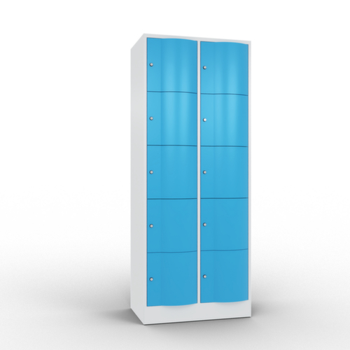 De naar voren gewelfde openslaande deur is absoluut stabiel en vandalismebestendig, zelfs tegen trappen. De enkelwerkende opdekdeuren zijn opgehangen aan robuuste, interne espagnoletscharnieren en dus bestand tegen zware belastingen. Elke deur is standaard uitgerust met een systeem voor gedempte sluiting , zodat de deur niet dichtslaat, zelfs niet wanneer deze een krachtige duw krijgt. Dit draagt niet alleen bij aan een rustigere werkomgeving, maar beschermt de stalen kast ook tegen beschadiging. Bovendien beschermt de deuropeningsbegrenzer tegen te ver openen van de deur en tegen overlapping van de bruikbare ruimte met de naastgelegen kast. afsluitbaar met cilinderslot. De ventilatieopeningen in de achterwand zorgen voor een goede luchtcirculatie in elk kastvak. Door de afdekplaat kan de bijzetkast worden gebruikt als extra werk- of aflegoppervlak. De sokkel onder de kast zorgt ervoor dat het gewicht van de kast gelijkmatig over de vloer wordt verdeeld. Hierdoor staat de kast stabieler en kan hij zwaardere lasten dragen dan een kast met voeten. En omdat er geen vuil, stof en vocht onder kan komen, hoeft er onder de kast niet te worden schoongemaakt. constructie van plaatstaal, gelast. romp met moffellak. front met moffellak.