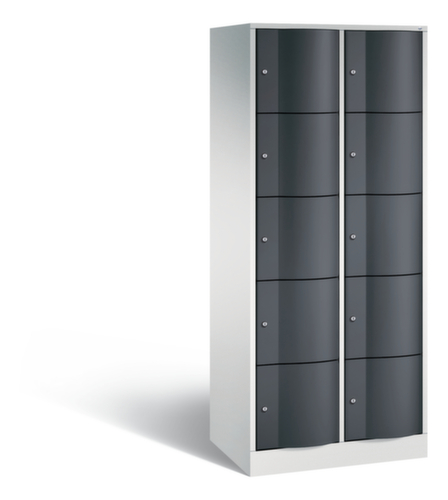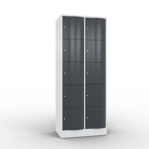 De naar voren gewelfde openslaande deur is absoluut stabiel en vandalismebestendig, zelfs tegen trappen. De enkelwerkende opdekdeuren zijn opgehangen aan robuuste, interne espagnoletscharnieren en dus bestand tegen zware belastingen. Elke deur is standaard uitgerust met een systeem voor gedempte sluiting , zodat de deur niet dichtslaat, zelfs niet wanneer deze een krachtige duw krijgt. Dit draagt niet alleen bij aan een rustigere werkomgeving, maar beschermt de stalen kast ook tegen beschadiging. Bovendien beschermt de deuropeningsbegrenzer tegen te ver openen van de deur en tegen overlapping van de bruikbare ruimte met de naastgelegen kast. afsluitbaar met cilinderslot. De ventilatieopeningen in de achterwand zorgen voor een goede luchtcirculatie in elk kastvak. Door de afdekplaat kan de bijzetkast worden gebruikt als extra werk- of aflegoppervlak. De sokkel onder de kast zorgt ervoor dat het gewicht van de kast gelijkmatig over de vloer wordt verdeeld. Hierdoor staat de kast stabieler en kan hij zwaardere lasten dragen dan een kast met voeten. En omdat er geen vuil, stof en vocht onder kan komen, hoeft er onder de kast niet te worden schoongemaakt. constructie van plaatstaal, gelast. romp met moffellak. front met moffellak.