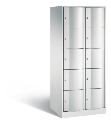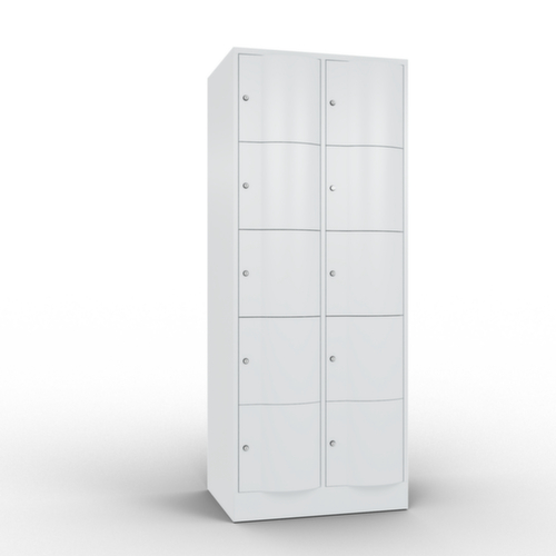 De naar voren gewelfde openslaande deur is absoluut stabiel en vandalismebestendig, zelfs tegen trappen. De enkelwerkende opdekdeuren zijn opgehangen aan robuuste, interne espagnoletscharnieren en dus bestand tegen zware belastingen. Elke deur is standaard uitgerust met een systeem voor gedempte sluiting , zodat de deur niet dichtslaat, zelfs niet wanneer deze een krachtige duw krijgt. Dit draagt niet alleen bij aan een rustigere werkomgeving, maar beschermt de stalen kast ook tegen beschadiging. Bovendien beschermt de deuropeningsbegrenzer tegen te ver openen van de deur en tegen overlapping van de bruikbare ruimte met de naastgelegen kast. afsluitbaar met cilinderslot. De ventilatieopeningen in de achterwand zorgen voor een goede luchtcirculatie in elk kastvak. Door de afdekplaat kan de bijzetkast worden gebruikt als extra werk- of aflegoppervlak. De sokkel onder de kast zorgt ervoor dat het gewicht van de kast gelijkmatig over de vloer wordt verdeeld. Hierdoor staat de kast stabieler en kan hij zwaardere lasten dragen dan een kast met voeten. En omdat er geen vuil, stof en vocht onder kan komen, hoeft er onder de kast niet te worden schoongemaakt. constructie van plaatstaal, gelast. romp met moffellak. front met moffellak.