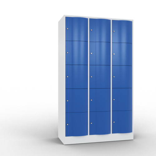 De naar voren gewelfde openslaande deur is absoluut stabiel en vandalismebestendig, zelfs tegen trappen. De enkelwerkende opdekdeuren zijn opgehangen aan robuuste, interne espagnoletscharnieren en dus bestand tegen zware belastingen. Elke deur is standaard uitgerust met een systeem voor gedempte sluiting , zodat de deur niet dichtslaat, zelfs niet wanneer deze een krachtige duw krijgt. Dit draagt niet alleen bij aan een rustigere werkomgeving, maar beschermt de stalen kast ook tegen beschadiging. Bovendien beschermt de deuropeningsbegrenzer tegen te ver openen van de deur en tegen overlapping van de bruikbare ruimte met de naastgelegen kast. afsluitbaar met cilinderslot. De ventilatieopeningen in de achterwand zorgen voor een goede luchtcirculatie in elk kastvak. Door de afdekplaat kan de bijzetkast worden gebruikt als extra werk- of aflegoppervlak. De sokkel onder de kast zorgt ervoor dat het gewicht van de kast gelijkmatig over de vloer wordt verdeeld. Hierdoor staat de kast stabieler en kan hij zwaardere lasten dragen dan een kast met voeten. En omdat er geen vuil, stof en vocht onder kan komen, hoeft er onder de kast niet te worden schoongemaakt. constructie van plaatstaal, gelast. romp met moffellak. front met moffellak.
