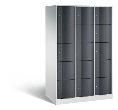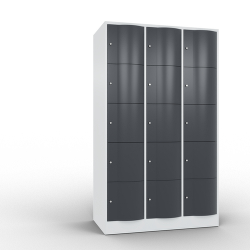 De naar voren gewelfde openslaande deur is absoluut stabiel en vandalismebestendig, zelfs tegen trappen. De enkelwerkende opdekdeuren zijn opgehangen aan robuuste, interne espagnoletscharnieren en dus bestand tegen zware belastingen. Elke deur is standaard uitgerust met een systeem voor gedempte sluiting , zodat de deur niet dichtslaat, zelfs niet wanneer deze een krachtige duw krijgt. Dit draagt niet alleen bij aan een rustigere werkomgeving, maar beschermt de stalen kast ook tegen beschadiging. Bovendien beschermt de deuropeningsbegrenzer tegen te ver openen van de deur en tegen overlapping van de bruikbare ruimte met de naastgelegen kast. afsluitbaar met cilinderslot. De ventilatieopeningen in de achterwand zorgen voor een goede luchtcirculatie in elk kastvak. Door de afdekplaat kan de bijzetkast worden gebruikt als extra werk- of aflegoppervlak. De sokkel onder de kast zorgt ervoor dat het gewicht van de kast gelijkmatig over de vloer wordt verdeeld. Hierdoor staat de kast stabieler en kan hij zwaardere lasten dragen dan een kast met voeten. En omdat er geen vuil, stof en vocht onder kan komen, hoeft er onder de kast niet te worden schoongemaakt. constructie van plaatstaal, gelast. romp met moffellak. front met moffellak.