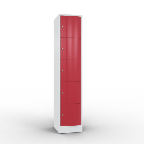 De naar voren gewelfde openslaande deur is absoluut stabiel en vandalismebestendig, zelfs tegen trappen. De enkelwerkende opdekdeuren zijn opgehangen aan robuuste, interne espagnoletscharnieren en dus bestand tegen zware belastingen. Elke deur is standaard uitgerust met een systeem voor gedempte sluiting , zodat de deur niet dichtslaat, zelfs niet wanneer deze een krachtige duw krijgt. Dit draagt niet alleen bij aan een rustigere werkomgeving, maar beschermt de stalen kast ook tegen beschadiging. Bovendien beschermt de deuropeningsbegrenzer tegen te ver openen van de deur en tegen overlapping van de bruikbare ruimte met de naastgelegen kast. afsluitbaar met cilinderslot. De ventilatieopeningen in de achterwand zorgen voor een goede luchtcirculatie in elk kastvak. Door de afdekplaat kan de bijzetkast worden gebruikt als extra werk- of aflegoppervlak. De sokkel onder de kast zorgt ervoor dat het gewicht van de kast gelijkmatig over de vloer wordt verdeeld. Hierdoor staat de kast stabieler en kan hij zwaardere lasten dragen dan een kast met voeten. En omdat er geen vuil, stof en vocht onder kan komen, hoeft er onder de kast niet te worden schoongemaakt. constructie van plaatstaal, gelast. romp met moffellak. front met moffellak.