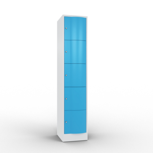 De naar voren gewelfde openslaande deur is absoluut stabiel en vandalismebestendig, zelfs tegen trappen. De enkelwerkende opdekdeuren zijn opgehangen aan robuuste, interne espagnoletscharnieren en dus bestand tegen zware belastingen. Elke deur is standaard uitgerust met een systeem voor gedempte sluiting , zodat de deur niet dichtslaat, zelfs niet wanneer deze een krachtige duw krijgt. Dit draagt niet alleen bij aan een rustigere werkomgeving, maar beschermt de stalen kast ook tegen beschadiging. Bovendien beschermt de deuropeningsbegrenzer tegen te ver openen van de deur en tegen overlapping van de bruikbare ruimte met de naastgelegen kast. afsluitbaar met cilinderslot. De ventilatieopeningen in de achterwand zorgen voor een goede luchtcirculatie in elk kastvak. Door de afdekplaat kan de bijzetkast worden gebruikt als extra werk- of aflegoppervlak. De sokkel onder de kast zorgt ervoor dat het gewicht van de kast gelijkmatig over de vloer wordt verdeeld. Hierdoor staat de kast stabieler en kan hij zwaardere lasten dragen dan een kast met voeten. En omdat er geen vuil, stof en vocht onder kan komen, hoeft er onder de kast niet te worden schoongemaakt. constructie van plaatstaal, gelast. romp met moffellak. front met moffellak.