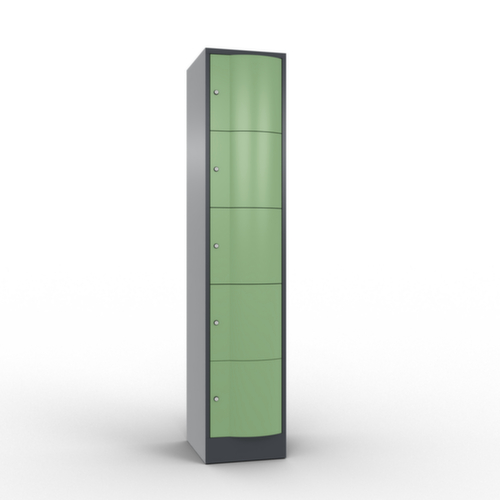 De naar voren gewelfde openslaande deur is absoluut stabiel en vandalismebestendig, zelfs tegen trappen. De enkelwerkende opdekdeuren zijn opgehangen aan robuuste, interne espagnoletscharnieren en dus bestand tegen zware belastingen. Elke deur is standaard uitgerust met een systeem voor gedempte sluiting , zodat de deur niet dichtslaat, zelfs niet wanneer deze een krachtige duw krijgt. Dit draagt niet alleen bij aan een rustigere werkomgeving, maar beschermt de stalen kast ook tegen beschadiging. Bovendien beschermt de deuropeningsbegrenzer tegen te ver openen van de deur en tegen overlapping van de bruikbare ruimte met de naastgelegen kast. afsluitbaar met cilinderslot. De ventilatieopeningen in de achterwand zorgen voor een goede luchtcirculatie in elk kastvak. Door de afdekplaat kan de bijzetkast worden gebruikt als extra werk- of aflegoppervlak. De sokkel onder de kast zorgt ervoor dat het gewicht van de kast gelijkmatig over de vloer wordt verdeeld. Hierdoor staat de kast stabieler en kan hij zwaardere lasten dragen dan een kast met voeten. En omdat er geen vuil, stof en vocht onder kan komen, hoeft er onder de kast niet te worden schoongemaakt. constructie van plaatstaal, gelast. romp met moffellak. front met moffellak.