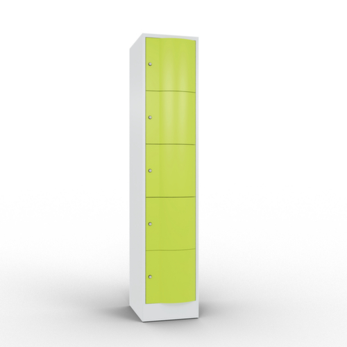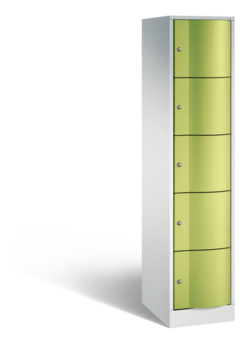 De naar voren gewelfde openslaande deur is absoluut stabiel en vandalismebestendig, zelfs tegen trappen. De enkelwerkende opdekdeuren zijn opgehangen aan robuuste, interne espagnoletscharnieren en dus bestand tegen zware belastingen. Elke deur is standaard uitgerust met een systeem voor gedempte sluiting , zodat de deur niet dichtslaat, zelfs niet wanneer deze een krachtige duw krijgt. Dit draagt niet alleen bij aan een rustigere werkomgeving, maar beschermt de stalen kast ook tegen beschadiging. Bovendien beschermt de deuropeningsbegrenzer tegen te ver openen van de deur en tegen overlapping van de bruikbare ruimte met de naastgelegen kast. afsluitbaar met cilinderslot. De ventilatieopeningen in de achterwand zorgen voor een goede luchtcirculatie in elk kastvak. Door de afdekplaat kan de bijzetkast worden gebruikt als extra werk- of aflegoppervlak. De sokkel onder de kast zorgt ervoor dat het gewicht van de kast gelijkmatig over de vloer wordt verdeeld. Hierdoor staat de kast stabieler en kan hij zwaardere lasten dragen dan een kast met voeten. En omdat er geen vuil, stof en vocht onder kan komen, hoeft er onder de kast niet te worden schoongemaakt. constructie van plaatstaal, gelast. romp met moffellak. front met moffellak.