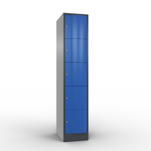 De naar voren gewelfde openslaande deur is absoluut stabiel en vandalismebestendig, zelfs tegen trappen. De enkelwerkende opdekdeuren zijn opgehangen aan robuuste, interne espagnoletscharnieren en dus bestand tegen zware belastingen. Elke deur is standaard uitgerust met een systeem voor gedempte sluiting , zodat de deur niet dichtslaat, zelfs niet wanneer deze een krachtige duw krijgt. Dit draagt niet alleen bij aan een rustigere werkomgeving, maar beschermt de stalen kast ook tegen beschadiging. Bovendien beschermt de deuropeningsbegrenzer tegen te ver openen van de deur en tegen overlapping van de bruikbare ruimte met de naastgelegen kast. afsluitbaar met cilinderslot. De ventilatieopeningen in de achterwand zorgen voor een goede luchtcirculatie in elk kastvak. Door de afdekplaat kan de bijzetkast worden gebruikt als extra werk- of aflegoppervlak. De sokkel onder de kast zorgt ervoor dat het gewicht van de kast gelijkmatig over de vloer wordt verdeeld. Hierdoor staat de kast stabieler en kan hij zwaardere lasten dragen dan een kast met voeten. En omdat er geen vuil, stof en vocht onder kan komen, hoeft er onder de kast niet te worden schoongemaakt. constructie van plaatstaal, gelast. romp met moffellak. front met moffellak.
