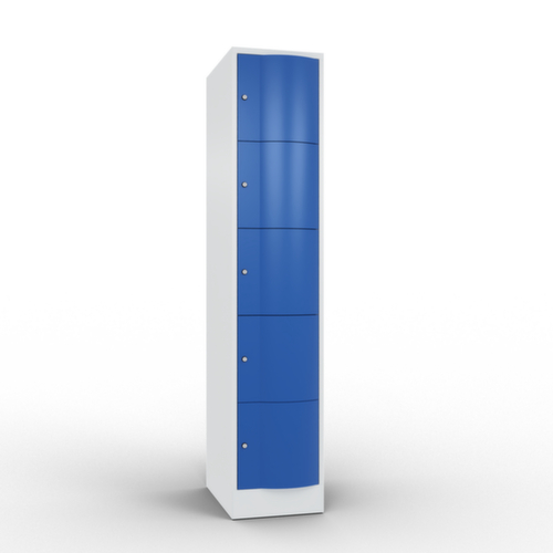 De naar voren gewelfde openslaande deur is absoluut stabiel en vandalismebestendig, zelfs tegen trappen. De enkelwerkende opdekdeuren zijn opgehangen aan robuuste, interne espagnoletscharnieren en dus bestand tegen zware belastingen. Elke deur is standaard uitgerust met een systeem voor gedempte sluiting , zodat de deur niet dichtslaat, zelfs niet wanneer deze een krachtige duw krijgt. Dit draagt niet alleen bij aan een rustigere werkomgeving, maar beschermt de stalen kast ook tegen beschadiging. Bovendien beschermt de deuropeningsbegrenzer tegen te ver openen van de deur en tegen overlapping van de bruikbare ruimte met de naastgelegen kast. afsluitbaar met cilinderslot. De ventilatieopeningen in de achterwand zorgen voor een goede luchtcirculatie in elk kastvak. Door de afdekplaat kan de bijzetkast worden gebruikt als extra werk- of aflegoppervlak. De sokkel onder de kast zorgt ervoor dat het gewicht van de kast gelijkmatig over de vloer wordt verdeeld. Hierdoor staat de kast stabieler en kan hij zwaardere lasten dragen dan een kast met voeten. En omdat er geen vuil, stof en vocht onder kan komen, hoeft er onder de kast niet te worden schoongemaakt. constructie van plaatstaal, gelast. romp met moffellak. front met moffellak.