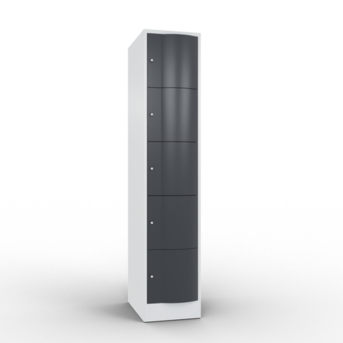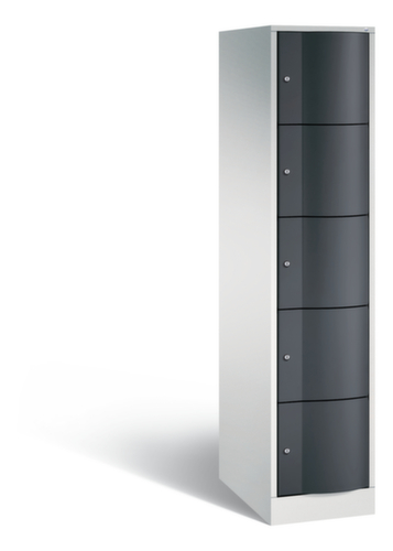 De naar voren gewelfde openslaande deur is absoluut stabiel en vandalismebestendig, zelfs tegen trappen. De enkelwerkende opdekdeuren zijn opgehangen aan robuuste, interne espagnoletscharnieren en dus bestand tegen zware belastingen. Elke deur is standaard uitgerust met een systeem voor gedempte sluiting , zodat de deur niet dichtslaat, zelfs niet wanneer deze een krachtige duw krijgt. Dit draagt niet alleen bij aan een rustigere werkomgeving, maar beschermt de stalen kast ook tegen beschadiging. Bovendien beschermt de deuropeningsbegrenzer tegen te ver openen van de deur en tegen overlapping van de bruikbare ruimte met de naastgelegen kast. afsluitbaar met cilinderslot. De ventilatieopeningen in de achterwand zorgen voor een goede luchtcirculatie in elk kastvak. Door de afdekplaat kan de bijzetkast worden gebruikt als extra werk- of aflegoppervlak. De sokkel onder de kast zorgt ervoor dat het gewicht van de kast gelijkmatig over de vloer wordt verdeeld. Hierdoor staat de kast stabieler en kan hij zwaardere lasten dragen dan een kast met voeten. En omdat er geen vuil, stof en vocht onder kan komen, hoeft er onder de kast niet te worden schoongemaakt. constructie van plaatstaal, gelast. romp met moffellak. front met moffellak.