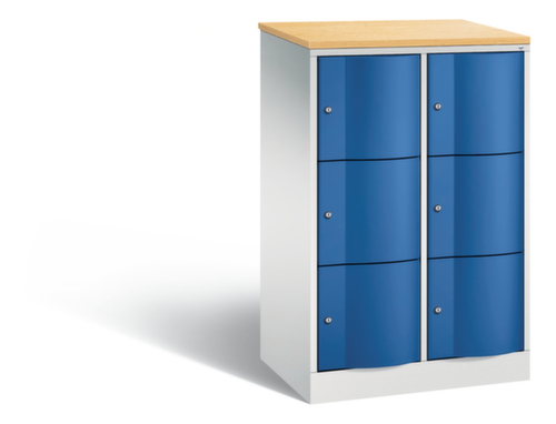 De naar voren gewelfde openslaande deur is absoluut stabiel en vandalismebestendig, zelfs tegen trappen. De enkelwerkende opdekdeuren zijn opgehangen aan robuuste, interne espagnoletscharnieren en dus bestand tegen zware belastingen. Elke deur is standaard uitgerust met een systeem voor gedempte sluiting , zodat de deur niet dichtslaat, zelfs niet wanneer deze een krachtige duw krijgt. Dit draagt niet alleen bij aan een rustigere werkomgeving, maar beschermt de stalen kast ook tegen beschadiging. Bovendien beschermt de deuropeningsbegrenzer tegen te ver openen van de deur en tegen overlapping van de bruikbare ruimte met de naastgelegen kast. afsluitbaar met cilinderslot. De ventilatieopeningen in de achterwand zorgen voor een goede luchtcirculatie in elk kastvak. Door de afdekplaat kan de bijzetkast worden gebruikt als extra werk- of aflegoppervlak. De sokkel onder de kast zorgt ervoor dat het gewicht van de kast gelijkmatig over de vloer wordt verdeeld. Hierdoor staat de kast stabieler en kan hij zwaardere lasten dragen dan een kast met voeten. En omdat er geen vuil, stof en vocht onder kan komen, hoeft er onder de kast niet te worden schoongemaakt. constructie van plaatstaal, gelast. romp met moffellak. front met moffellak. blad in decor In kleur van de romp.