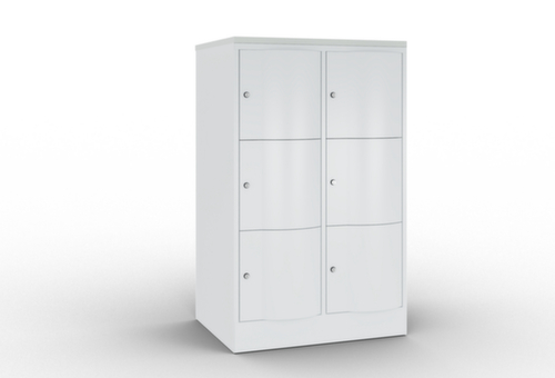 De naar voren gewelfde openslaande deur is absoluut stabiel en vandalismebestendig, zelfs tegen trappen. De enkelwerkende opdekdeuren zijn opgehangen aan robuuste, interne espagnoletscharnieren en dus bestand tegen zware belastingen. Elke deur is standaard uitgerust met een systeem voor gedempte sluiting , zodat de deur niet dichtslaat, zelfs niet wanneer deze een krachtige duw krijgt. Dit draagt niet alleen bij aan een rustigere werkomgeving, maar beschermt de stalen kast ook tegen beschadiging. Bovendien beschermt de deuropeningsbegrenzer tegen te ver openen van de deur en tegen overlapping van de bruikbare ruimte met de naastgelegen kast. afsluitbaar met cilinderslot. De ventilatieopeningen in de achterwand zorgen voor een goede luchtcirculatie in elk kastvak. Door de afdekplaat kan de bijzetkast worden gebruikt als extra werk- of aflegoppervlak. De sokkel onder de kast zorgt ervoor dat het gewicht van de kast gelijkmatig over de vloer wordt verdeeld. Hierdoor staat de kast stabieler en kan hij zwaardere lasten dragen dan een kast met voeten. En omdat er geen vuil, stof en vocht onder kan komen, hoeft er onder de kast niet te worden schoongemaakt. constructie van plaatstaal, gelast. romp met moffellak. front met moffellak. blad in decor In kleur van de romp.