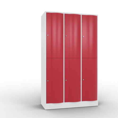 De naar voren gewelfde openslaande deur is absoluut stabiel en vandalismebestendig, zelfs tegen trappen. De enkelwerkende opdekdeuren zijn opgehangen aan robuuste, interne espagnoletscharnieren en dus bestand tegen zware belastingen. Elke deur is standaard uitgerust met een systeem voor gedempte sluiting , zodat de deur niet dichtslaat, zelfs niet wanneer deze een krachtige duw krijgt. Dit draagt niet alleen bij aan een rustigere werkomgeving, maar beschermt de stalen kast ook tegen beschadiging. Bovendien beschermt de deuropeningsbegrenzer tegen te ver openen van de deur en tegen overlapping van de bruikbare ruimte met de naastgelegen kast. afsluitbaar met cilinderslot. De ventilatieopeningen in de achterwand zorgen voor een goede luchtcirculatie in elk kastvak. Door de afdekplaat kan de bijzetkast worden gebruikt als extra werk- of aflegoppervlak. De sokkel onder de kast zorgt ervoor dat het gewicht van de kast gelijkmatig over de vloer wordt verdeeld. Hierdoor staat de kast stabieler en kan hij zwaardere lasten dragen dan een kast met voeten. En omdat er geen vuil, stof en vocht onder kan komen, hoeft er onder de kast niet te worden schoongemaakt. constructie van plaatstaal, gelast. romp met moffellak. front met moffellak.