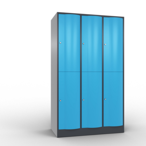 De naar voren gewelfde openslaande deur is absoluut stabiel en vandalismebestendig, zelfs tegen trappen. De enkelwerkende opdekdeuren zijn opgehangen aan robuuste, interne espagnoletscharnieren en dus bestand tegen zware belastingen. Elke deur is standaard uitgerust met een systeem voor gedempte sluiting , zodat de deur niet dichtslaat, zelfs niet wanneer deze een krachtige duw krijgt. Dit draagt niet alleen bij aan een rustigere werkomgeving, maar beschermt de stalen kast ook tegen beschadiging. Bovendien beschermt de deuropeningsbegrenzer tegen te ver openen van de deur en tegen overlapping van de bruikbare ruimte met de naastgelegen kast. afsluitbaar met cilinderslot. De ventilatieopeningen in de achterwand zorgen voor een goede luchtcirculatie in elk kastvak. Door de afdekplaat kan de bijzetkast worden gebruikt als extra werk- of aflegoppervlak. De sokkel onder de kast zorgt ervoor dat het gewicht van de kast gelijkmatig over de vloer wordt verdeeld. Hierdoor staat de kast stabieler en kan hij zwaardere lasten dragen dan een kast met voeten. En omdat er geen vuil, stof en vocht onder kan komen, hoeft er onder de kast niet te worden schoongemaakt. constructie van plaatstaal, gelast. romp met moffellak. front met moffellak.