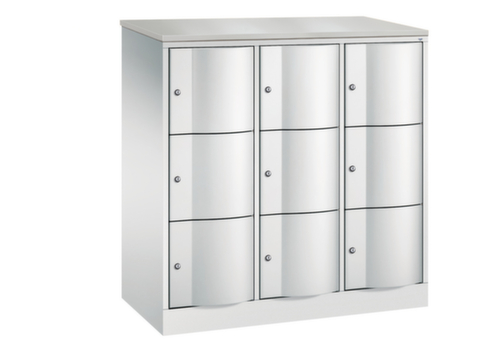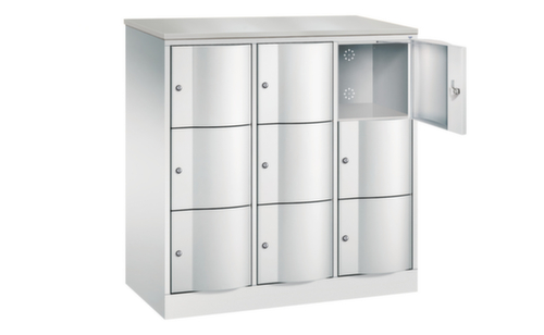 De naar voren gewelfde openslaande deur is absoluut stabiel en vandalismebestendig, zelfs tegen trappen. De enkelwerkende opdekdeuren zijn opgehangen aan robuuste, interne espagnoletscharnieren en dus bestand tegen zware belastingen. naar buiten gewelfde deuren met klinkscharnier en aanslagdemper. Elke deur is standaard uitgerust met een systeem voor gedempte sluiting , zodat de deur niet dichtslaat, zelfs niet wanneer deze een krachtige duw krijgt. Dit draagt niet alleen bij aan een rustigere werkomgeving, maar beschermt de stalen kast ook tegen beschadiging. Bovendien beschermt de deuropeningsbegrenzer tegen te ver openen van de deur en tegen overlapping van de bruikbare ruimte met de naastgelegen kast. afsluitbaar met cilinderslot. De ventilatieopeningen in de achterwand zorgen voor een goede luchtcirculatie in elk kastvak. Door de afdekplaat kan de bijzetkast worden gebruikt als extra werk- of aflegoppervlak. De sokkel onder de kast zorgt ervoor dat het gewicht van de kast gelijkmatig over de vloer wordt verdeeld. Hierdoor staat de kast stabieler en kan hij zwaardere lasten dragen dan een kast met voeten. En omdat er geen vuil, stof en vocht onder kan komen, hoeft er onder de kast niet te worden schoongemaakt. constructie van plaatstaal, gelast. romp met moffellak in zwart. front met moffellak in alu-kleuren. blad in decor In kleur van de romp.