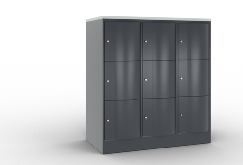 De naar voren gewelfde openslaande deur is absoluut stabiel en vandalismebestendig, zelfs tegen trappen. De enkelwerkende opdekdeuren zijn opgehangen aan robuuste, interne espagnoletscharnieren en dus bestand tegen zware belastingen. Elke deur is standaard uitgerust met een systeem voor gedempte sluiting , zodat de deur niet dichtslaat, zelfs niet wanneer deze een krachtige duw krijgt. Dit draagt niet alleen bij aan een rustigere werkomgeving, maar beschermt de stalen kast ook tegen beschadiging. Bovendien beschermt de deuropeningsbegrenzer tegen te ver openen van de deur en tegen overlapping van de bruikbare ruimte met de naastgelegen kast. afsluitbaar met cilinderslot. De ventilatieopeningen in de achterwand zorgen voor een goede luchtcirculatie in elk kastvak. Door de afdekplaat kan de bijzetkast worden gebruikt als extra werk- of aflegoppervlak. De sokkel onder de kast zorgt ervoor dat het gewicht van de kast gelijkmatig over de vloer wordt verdeeld. Hierdoor staat de kast stabieler en kan hij zwaardere lasten dragen dan een kast met voeten. En omdat er geen vuil, stof en vocht onder kan komen, hoeft er onder de kast niet te worden schoongemaakt. constructie van plaatstaal, gelast. romp met moffellak. front met moffellak. blad in decor In kleur van de romp.