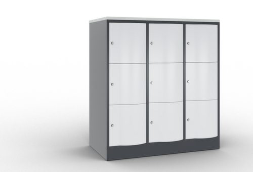 De naar voren gewelfde openslaande deur is absoluut stabiel en vandalismebestendig, zelfs tegen trappen. De enkelwerkende opdekdeuren zijn opgehangen aan robuuste, interne espagnoletscharnieren en dus bestand tegen zware belastingen. Elke deur is standaard uitgerust met een systeem voor gedempte sluiting , zodat de deur niet dichtslaat, zelfs niet wanneer deze een krachtige duw krijgt. Dit draagt niet alleen bij aan een rustigere werkomgeving, maar beschermt de stalen kast ook tegen beschadiging. Bovendien beschermt de deuropeningsbegrenzer tegen te ver openen van de deur en tegen overlapping van de bruikbare ruimte met de naastgelegen kast. afsluitbaar met cilinderslot. De ventilatieopeningen in de achterwand zorgen voor een goede luchtcirculatie in elk kastvak. Door de afdekplaat kan de bijzetkast worden gebruikt als extra werk- of aflegoppervlak. De sokkel onder de kast zorgt ervoor dat het gewicht van de kast gelijkmatig over de vloer wordt verdeeld. Hierdoor staat de kast stabieler en kan hij zwaardere lasten dragen dan een kast met voeten. En omdat er geen vuil, stof en vocht onder kan komen, hoeft er onder de kast niet te worden schoongemaakt. constructie van plaatstaal, gelast. romp met moffellak. front met moffellak. blad in decor In kleur van de romp.
