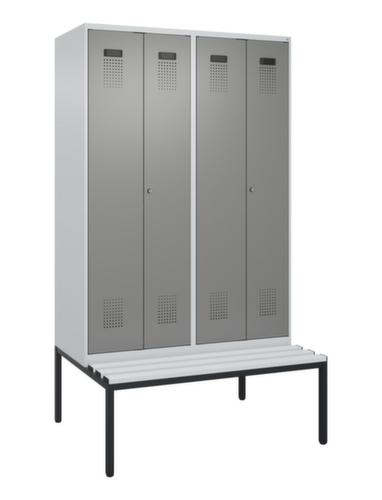 de belangrijkste maten van de C+P garderobekast Evolo PLUS in één oogopslag:per vak 1 stevige garderobestang met ovaal profiel en 3 niet verdraaiende dubbele schuifhaken, daarboven een doorlopende hoedenplank met de breedte van 2 vakken. Deze extra brede plank is ideaal voor het opbergen van PBM-uitrusting zoals helmen, gezichts- of gehoorbescherming. De dubbele openslaande deuren kunnen met de handige etiketvensters heel eenvoudig worden gepersonaliseerd. Dankzij de design-perforatie, die voor een belangrijk deel aan de ventilatie bijdraagt, houdt de kast toch een strakke look en is hij hygiënisch en gemakkelijk te reinigen. Door de binnenliggende penscharnieren zien de inliggende deuren er strak uit, want aan de buitenkant zijn geen schroeven of scharnieren zichtbaar. Dus de scharnieren doen geen afbreuk aan het design waardoor de hele kast er hoogwaardiger uitziet. Bovendien is het gladde oppervlak gemakkelijker te reinigen, zonder moeilijk bereikbare plaatsen waar vuil of stof zich kan ophopen. Elke deur is standaard uitgerust met een systeem voor gedempte sluiting , zodat de deur niet dichtslaat, zelfs niet wanneer deze een krachtige duw krijgt. Dit draagt niet alleen bij aan een rustigere werkomgeving, maar beschermt de stalen kast ook tegen beschadiging. Geïnspireerd door de natuur levert het BIONIC Steel Frame een bijzonder efficiënte en stabiele constructie op. De torsiestijfheid neemt verder toe door een ingenieuze structuur aan de binnenkant met plooien, steunen en tussenruimten, en door materiaalversterking op belangrijke punten, zoals aan de voorkant van de zijwanden en in de scheidingswand en kokerprofielen. Er zijn 2 vakken beschikbaar per persoon, die kunnen worden afgesloten met naar elkaar dichtslaande deuren. Dit maakt het gemakkelijk om werk- en vrijetijdskleding strikt en netjes gescheiden te houden. Dankzij het uitgekiende concept van natuurlijke ventilatie is een constructief geoptimaliseerde luchtcirculatie mogelijk. Aangebrachte ventilerende vrije ruimtes voor en achter het legbord en ventilatieopeningen in bodem en dak dragen in combinatie met de perforatie in de deur bij aan een aangename luchtstroming. . Dit zorgt voor voldoende ventilatie in de kast waardoor de inhoud sneller droogt zonder onaangename geurtjes. De geïntegreerde bank zorgt voor een efficiënt gebruik van de beschikbare ruimte. Dit maakt aan- en uitkleden gemakkelijk en biedt opbergruimte onder de kast zonder extra ruimte in beslag te nemen. De randen zijn van Kunststof met stalen kern - hygiënische, onderhoudsvriendelijke en tegelijk uiterst stabiele zitting. Door de hoge belastbaarheid en duurzaamheid bij uitstek geschikt voor plekken waar mensen zich vaak moeten omkleden. Het ondergebouwde voetonderstel vermindert mogelijke ophoping van vuil en stof, omdat het gemakkelijker is om alle oppervlakken volledig te reinigen. Bovendien ontstaat hierdoor extra opbergruimte onder de kast. Schoenen en tassen staan niet meer in de weg, het risico op struikelen wordt kleiner. constructie van staal, stevig gelast. Dit maakt de constructie zeer robuust en sterk en dus duurzamer. Omdat de hoeken en randen van de romp gelast zijn, is de kast goed afgedicht en dus beter beschermd tegen stof, vocht en vuil dan bij een schroefconstructie. Bovendien is regelmatig onderhoud en nastellen niet nodig. romp met moffellak in RAL7035 lichtgrijs, front met moffellak in RAL 0005000 Staalgrijs.