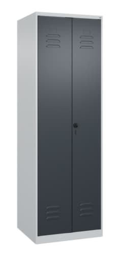 De belangrijkste details van de C+P schoonmaakkast Classic Plus in één oogopslag:Via de dubbele openslaande deur is de kast zeer goed toegankelijk. De ventilatieopeningen zorgen voor meer ventilatie en omdat een goede luchtcirculatie het vochtgehalte reduceert, wordt de inhoud van de kast beschermd tegen vocht en schimmelgroei. Door de binnenliggende penscharnieren zien de inliggende deuren er strak uit, want aan de buitenkant zijn geen schroeven of scharnieren zichtbaar. Dus de scharnieren doen geen afbreuk aan het design waardoor de hele kast er hoogwaardiger uitziet. Bovendien is het gladde oppervlak gemakkelijker te reinigen, zonder moeilijk bereikbare plaatsen waar vuil of stof zich kan ophopen. Elke deur is standaard uitgerust met een systeem voor gedempte sluiting , zodat de deur niet dichtslaat, zelfs niet wanneer deze een krachtige duw krijgt. Dit draagt niet alleen bij aan een rustigere werkomgeving, maar beschermt de stalen kast ook tegen beschadiging. 4 niveaus met legbord. De ingekorte scheidingswand verdeelt de kast in twee afzonderlijke delen die op verschillende manieren en voor voorwerpen van verschillende afmetingen gebruikt kunnen worden. In het onderste deel is plaats voor schoonmaakemmers of reinigingsapparaten. Links uitgerust met 4 vakken met vaste legborden, rechts met 1 stevige garderobestang met een ovaal profiel en 4 dubbele, niet verdraaibare schuifhaken. afsluitbaar met Veiligheidsdraaigrendel voor hangslot. Het veiligheidsslot is uitermate goed bestand tegen inbraak, omdat het doordraait wanneer het is vergrendeld en pas grijpt wanneer het slot is verwijderd. deuren gemeenschappelijk afsluitbaar. De extra ventilatieopeningen in het vak, in combinatie met de ventilatiesleuven in de deur, verbeteren de luchtstroom. Dit zorgt voor een goede ventilatie in de kast waardoor de inhoud sneller droogt zonder onaangename geurtjes. De kast staat direct op de vloer, zonder sokkel of poten, voor een compacte en ruimtebesparende look. Alleen stelschroeven zorgen voor een stabiele stand als de vloer eventueel ongelijk is. De bodem van de kast is tevens verzinkt voor een betere bescherming tegen corrosie. romp met moffellak in RAL7035 lichtgrijs. front met moffellak in RAL7016 antracietgrijs.