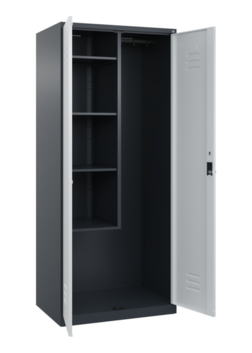 De belangrijkste details van de C+P schoonmaakkast Classic Plus in één oogopslag:Via de dubbele openslaande deur is de kast zeer goed toegankelijk. De ventilatieopeningen zorgen voor meer ventilatie en omdat een goede luchtcirculatie het vochtgehalte reduceert, wordt de inhoud van de kast beschermd tegen vocht en schimmelgroei. Door de binnenliggende penscharnieren zien de inliggende deuren er strak uit, want aan de buitenkant zijn geen schroeven of scharnieren zichtbaar. Dus de scharnieren doen geen afbreuk aan het design waardoor de hele kast er hoogwaardiger uitziet. Bovendien is het gladde oppervlak gemakkelijker te reinigen, zonder moeilijk bereikbare plaatsen waar vuil of stof zich kan ophopen. Elke deur is standaard uitgerust met een systeem voor gedempte sluiting , zodat de deur niet dichtslaat, zelfs niet wanneer deze een krachtige duw krijgt. Dit draagt niet alleen bij aan een rustigere werkomgeving, maar beschermt de stalen kast ook tegen beschadiging. 4 niveaus met legbord. De ingekorte scheidingswand verdeelt de kast in twee afzonderlijke delen die op verschillende manieren en voor voorwerpen van verschillende afmetingen gebruikt kunnen worden. In het onderste deel is plaats voor schoonmaakemmers of reinigingsapparaten. Links uitgerust met 4 vakken met vaste legborden, rechts met 1 stevige garderobestang met een ovaal profiel en 4 dubbele, niet verdraaibare schuifhaken. afsluitbaar met Veiligheidsdraaigrendel voor hangslot. Het veiligheidsslot is uitermate goed bestand tegen inbraak, omdat het doordraait wanneer het is vergrendeld en pas grijpt wanneer het slot is verwijderd. deuren gemeenschappelijk afsluitbaar. De extra ventilatieopeningen in het vak, in combinatie met de ventilatiesleuven in de deur, verbeteren de luchtstroom. Dit zorgt voor een goede ventilatie in de kast waardoor de inhoud sneller droogt zonder onaangename geurtjes. De kast staat direct op de vloer, zonder sokkel of poten, voor een compacte en ruimtebesparende look. Alleen stelschroeven zorgen voor een stabiele stand als de vloer eventueel ongelijk is. De bodem van de kast is tevens verzinkt voor een betere bescherming tegen corrosie. romp met moffellak in RAL7016 antracietgrijs. front met moffellak in RAL7016 antracietgrijs.