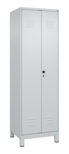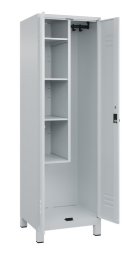 De belangrijkste details van de C+P schoonmaakkast Classic Plus in één oogopslag:Via de dubbele openslaande deur is de kast zeer goed toegankelijk. De ventilatieopeningen zorgen voor meer ventilatie en omdat een goede luchtcirculatie het vochtgehalte reduceert, wordt de inhoud van de kast beschermd tegen vocht en schimmelgroei. Door de binnenliggende penscharnieren zien de inliggende deuren er strak uit, want aan de buitenkant zijn geen schroeven of scharnieren zichtbaar. Dus de scharnieren doen geen afbreuk aan het design waardoor de hele kast er hoogwaardiger uitziet. Bovendien is het gladde oppervlak gemakkelijker te reinigen, zonder moeilijk bereikbare plaatsen waar vuil of stof zich kan ophopen. Elke deur is standaard uitgerust met een systeem voor gedempte sluiting , zodat de deur niet dichtslaat, zelfs niet wanneer deze een krachtige duw krijgt. Dit draagt niet alleen bij aan een rustigere werkomgeving, maar beschermt de stalen kast ook tegen beschadiging. 4 niveaus met legbord. De ingekorte scheidingswand verdeelt de kast in twee afzonderlijke delen die op verschillende manieren en voor voorwerpen van verschillende afmetingen gebruikt kunnen worden. In het onderste deel is plaats voor schoonmaakemmers of reinigingsapparaten. Links uitgerust met 4 vakken met vaste legborden, rechts met 1 stevige garderobestang met een ovaal profiel en 4 dubbele, niet verdraaibare schuifhaken. afsluitbaar met Veiligheidsdraaigrendel voor hangslot. Het veiligheidsslot is uitermate goed bestand tegen inbraak, omdat het doordraait wanneer het is vergrendeld en pas grijpt wanneer het slot is verwijderd. deuren gemeenschappelijk afsluitbaar. De extra ventilatieopeningen in het vak, in combinatie met de ventilatiesleuven in de deur, verbeteren de luchtstroom. Dit zorgt voor een goede ventilatie in de kast waardoor de inhoud sneller droogt zonder onaangename geurtjes. Door de kunststof voeten onder de kast ziet de kast er niet alleen modern en minder massief uit, maar de voeten bieden ook praktische voordelen. De ruimte onder de kast is gemakkelijker schoon te maken en het kunststof van de voeten biedt een betere bescherming tegen corrosie. Vooral in omgevingen waar hogere eisen aan de hygiëne worden gesteld, is dit een belangrijk aspect. romp met moffellak in RAL7035 lichtgrijs. front met moffellak in RAL7035 lichtgrijs.