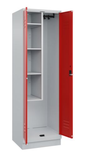 De belangrijkste details van de C+P schoonmaakkast Classic Plus in één oogopslag:Via de dubbele openslaande deur is de kast zeer goed toegankelijk. De ventilatieopeningen zorgen voor meer ventilatie en omdat een goede luchtcirculatie het vochtgehalte reduceert, wordt de inhoud van de kast beschermd tegen vocht en schimmelgroei. Door de binnenliggende penscharnieren zien de inliggende deuren er strak uit, want aan de buitenkant zijn geen schroeven of scharnieren zichtbaar. Dus de scharnieren doen geen afbreuk aan het design waardoor de hele kast er hoogwaardiger uitziet. Bovendien is het gladde oppervlak gemakkelijker te reinigen, zonder moeilijk bereikbare plaatsen waar vuil of stof zich kan ophopen. Elke deur is standaard uitgerust met een systeem voor gedempte sluiting , zodat de deur niet dichtslaat, zelfs niet wanneer deze een krachtige duw krijgt. Dit draagt niet alleen bij aan een rustigere werkomgeving, maar beschermt de stalen kast ook tegen beschadiging. 4 niveaus met legbord. De ingekorte scheidingswand verdeelt de kast in twee afzonderlijke delen die op verschillende manieren en voor voorwerpen van verschillende afmetingen gebruikt kunnen worden. In het onderste deel is plaats voor schoonmaakemmers of reinigingsapparaten. Links uitgerust met 4 vakken met vaste legborden, rechts met 1 stevige garderobestang met een ovaal profiel en 4 dubbele, niet verdraaibare schuifhaken. afsluitbaar met cilinderslot. deuren gemeenschappelijk afsluitbaar. De extra ventilatieopeningen in het vak, in combinatie met de ventilatiesleuven in de deur, verbeteren de luchtstroom. Dit zorgt voor een goede ventilatie in de kast waardoor de inhoud sneller droogt zonder onaangename geurtjes. De sokkel onder de kast zorgt ervoor dat het gewicht van de kast gelijkmatig over de vloer wordt verdeeld. Hierdoor staat de kast stabieler en kan hij zwaardere lasten dragen dan een kast met voeten. En omdat er geen vuil, stof en vocht onder kan komen, hoeft er onder de kast niet te worden schoongemaakt. romp met moffellak in RAL7035 lichtgrijs. front met moffellak in RAL3020 verkeersrood.