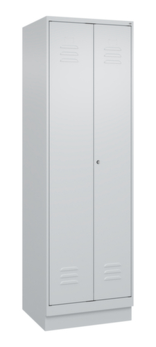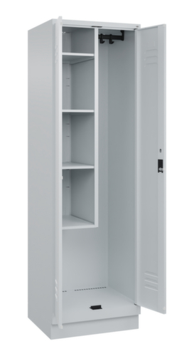 De belangrijkste details van de C+P schoonmaakkast Classic Plus in één oogopslag:Via de dubbele openslaande deur is de kast zeer goed toegankelijk. De ventilatieopeningen zorgen voor meer ventilatie en omdat een goede luchtcirculatie het vochtgehalte reduceert, wordt de inhoud van de kast beschermd tegen vocht en schimmelgroei. Door de binnenliggende penscharnieren zien de inliggende deuren er strak uit, want aan de buitenkant zijn geen schroeven of scharnieren zichtbaar. Dus de scharnieren doen geen afbreuk aan het design waardoor de hele kast er hoogwaardiger uitziet. Bovendien is het gladde oppervlak gemakkelijker te reinigen, zonder moeilijk bereikbare plaatsen waar vuil of stof zich kan ophopen. Elke deur is standaard uitgerust met een systeem voor gedempte sluiting , zodat de deur niet dichtslaat, zelfs niet wanneer deze een krachtige duw krijgt. Dit draagt niet alleen bij aan een rustigere werkomgeving, maar beschermt de stalen kast ook tegen beschadiging. 4 niveaus met legbord. De ingekorte scheidingswand verdeelt de kast in twee afzonderlijke delen die op verschillende manieren en voor voorwerpen van verschillende afmetingen gebruikt kunnen worden. In het onderste deel is plaats voor schoonmaakemmers of reinigingsapparaten. Links uitgerust met 4 vakken met vaste legborden, rechts met 1 stevige garderobestang met een ovaal profiel en 4 dubbele, niet verdraaibare schuifhaken. afsluitbaar met cilinderslot. deuren gemeenschappelijk afsluitbaar. De extra ventilatieopeningen in het vak, in combinatie met de ventilatiesleuven in de deur, verbeteren de luchtstroom. Dit zorgt voor een goede ventilatie in de kast waardoor de inhoud sneller droogt zonder onaangename geurtjes. De sokkel onder de kast zorgt ervoor dat het gewicht van de kast gelijkmatig over de vloer wordt verdeeld. Hierdoor staat de kast stabieler en kan hij zwaardere lasten dragen dan een kast met voeten. En omdat er geen vuil, stof en vocht onder kan komen, hoeft er onder de kast niet te worden schoongemaakt. romp met moffellak in RAL7035 lichtgrijs. front met moffellak in RAL7035 lichtgrijs.