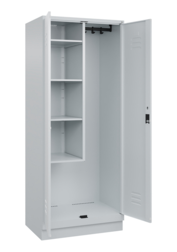 De belangrijkste details van de C+P schoonmaakkast Classic Plus in één oogopslag:Via de dubbele openslaande deur is de kast zeer goed toegankelijk. De ventilatieopeningen zorgen voor meer ventilatie en omdat een goede luchtcirculatie het vochtgehalte reduceert, wordt de inhoud van de kast beschermd tegen vocht en schimmelgroei. Door de binnenliggende penscharnieren zien de inliggende deuren er strak uit, want aan de buitenkant zijn geen schroeven of scharnieren zichtbaar. Dus de scharnieren doen geen afbreuk aan het design waardoor de hele kast er hoogwaardiger uitziet. Bovendien is het gladde oppervlak gemakkelijker te reinigen, zonder moeilijk bereikbare plaatsen waar vuil of stof zich kan ophopen. Elke deur is standaard uitgerust met een systeem voor gedempte sluiting , zodat de deur niet dichtslaat, zelfs niet wanneer deze een krachtige duw krijgt. Dit draagt niet alleen bij aan een rustigere werkomgeving, maar beschermt de stalen kast ook tegen beschadiging. 4 niveaus met legbord. De ingekorte scheidingswand verdeelt de kast in twee afzonderlijke delen die op verschillende manieren en voor voorwerpen van verschillende afmetingen gebruikt kunnen worden. In het onderste deel is plaats voor schoonmaakemmers of reinigingsapparaten. Links uitgerust met 4 vakken met vaste legborden, rechts met 1 stevige garderobestang met een ovaal profiel en 4 dubbele, niet verdraaibare schuifhaken. afsluitbaar met cilinderslot. deuren gemeenschappelijk afsluitbaar. De extra ventilatieopeningen in het vak, in combinatie met de ventilatiesleuven in de deur, verbeteren de luchtstroom. Dit zorgt voor een goede ventilatie in de kast waardoor de inhoud sneller droogt zonder onaangename geurtjes. De sokkel onder de kast zorgt ervoor dat het gewicht van de kast gelijkmatig over de vloer wordt verdeeld. Hierdoor staat de kast stabieler en kan hij zwaardere lasten dragen dan een kast met voeten. En omdat er geen vuil, stof en vocht onder kan komen, hoeft er onder de kast niet te worden schoongemaakt. romp met moffellak in RAL7035 lichtgrijs. front met moffellak in RAL7035 lichtgrijs.