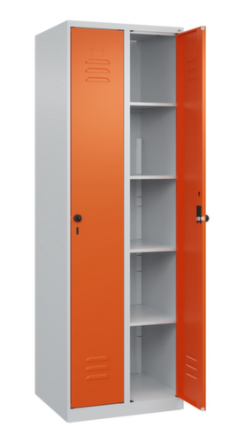 De belangrijkste afmetingen van de C+P wasgoedkast Classic Plus in één oogopslag:per vak 4 vaste legborden. openslaande deur met etikettenlijst en ventilatiesleuven. Door de binnenliggende penscharnieren zien de inliggende deuren er strak uit, want aan de buitenkant zijn geen schroeven of scharnieren zichtbaar. Dus de scharnieren doen geen afbreuk aan het design waardoor de hele kast er hoogwaardiger uitziet. Bovendien is het gladde oppervlak gemakkelijker te reinigen, zonder moeilijk bereikbare plaatsen waar vuil of stof zich kan ophopen. Elke deur is standaard uitgerust met een systeem voor gedempte sluiting , zodat de deur niet dichtslaat, zelfs niet wanneer deze een krachtige duw krijgt. Dit draagt niet alleen bij aan een rustigere werkomgeving, maar beschermt de stalen kast ook tegen beschadiging. Geïnspireerd door de natuur levert het BIONIC Steel Frame een bijzonder efficiënte en stabiele constructie op. De torsiestijfheid neemt verder toe door een ingenieuze structuur aan de binnenkant met plooien, steunen en tussenruimten, en door materiaalversterking op belangrijke punten, zoals aan de voorkant van de zijwanden en in de scheidingswand en kokerprofielen. Afsluitbaar met Veiligheidsdraaigrendel voor hangslot. Het veiligheidsslot is uitermate goed bestand tegen inbraak, omdat het doordraait wanneer het is vergrendeld en pas grijpt wanneer het slot is verwijderd. Passend voor alle hangsloten met een beugeldikte van 6 - 8 mm. De extra ventilatieopeningen in het vak, in combinatie met de ventilatiesleuven in de deur, verbeteren de luchtstroom. Dit zorgt voor een goede ventilatie in de kast waardoor de inhoud sneller droogt zonder onaangename geurtjes. De kast staat direct op de vloer, zonder sokkel of poten, voor een compacte en ruimtebesparende look. Alleen stelschroeven zorgen voor een stabiele stand als de vloer eventueel ongelijk is. De bodem van de kast is tevens verzinkt voor een betere bescherming tegen corrosie. constructie van staal, stevig gelast. Dit maakt de constructie zeer robuust en sterk en dus duurzamer. Omdat de hoeken en randen van de romp gelast zijn, is de kast goed afgedicht en dus beter beschermd tegen stof, vocht en vuil dan bij een schroefconstructie. Bovendien is regelmatig onderhoud en nastellen niet nodig. romp met moffellak in RAL7035 lichtgrijs, front met moffellak in RAL2004 zuiver oranje.
