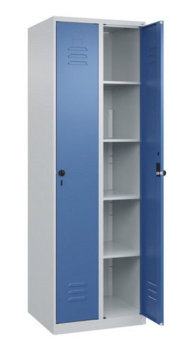 De belangrijkste afmetingen van de C+P wasgoedkast Classic Plus in één oogopslag:per vak 4 vaste legborden. openslaande deur met etikettenlijst en ventilatiesleuven. Door de binnenliggende penscharnieren zien de inliggende deuren er strak uit, want aan de buitenkant zijn geen schroeven of scharnieren zichtbaar. Dus de scharnieren doen geen afbreuk aan het design waardoor de hele kast er hoogwaardiger uitziet. Bovendien is het gladde oppervlak gemakkelijker te reinigen, zonder moeilijk bereikbare plaatsen waar vuil of stof zich kan ophopen. Elke deur is standaard uitgerust met een systeem voor gedempte sluiting , zodat de deur niet dichtslaat, zelfs niet wanneer deze een krachtige duw krijgt. Dit draagt niet alleen bij aan een rustigere werkomgeving, maar beschermt de stalen kast ook tegen beschadiging. Geïnspireerd door de natuur levert het BIONIC Steel Frame een bijzonder efficiënte en stabiele constructie op. De torsiestijfheid neemt verder toe door een ingenieuze structuur aan de binnenkant met plooien, steunen en tussenruimten, en door materiaalversterking op belangrijke punten, zoals aan de voorkant van de zijwanden en in de scheidingswand en kokerprofielen. Afsluitbaar met Veiligheidsdraaigrendel voor hangslot. Het veiligheidsslot is uitermate goed bestand tegen inbraak, omdat het doordraait wanneer het is vergrendeld en pas grijpt wanneer het slot is verwijderd. Passend voor alle hangsloten met een beugeldikte van 6 - 8 mm. De extra ventilatieopeningen in het vak, in combinatie met de ventilatiesleuven in de deur, verbeteren de luchtstroom. Dit zorgt voor een goede ventilatie in de kast waardoor de inhoud sneller droogt zonder onaangename geurtjes. De kast staat direct op de vloer, zonder sokkel of poten, voor een compacte en ruimtebesparende look. Alleen stelschroeven zorgen voor een stabiele stand als de vloer eventueel ongelijk is. De bodem van de kast is tevens verzinkt voor een betere bescherming tegen corrosie. constructie van staal, stevig gelast. Dit maakt de constructie zeer robuust en sterk en dus duurzamer. Omdat de hoeken en randen van de romp gelast zijn, is de kast goed afgedicht en dus beter beschermd tegen stof, vocht en vuil dan bij een schroefconstructie. Bovendien is regelmatig onderhoud en nastellen niet nodig. romp met moffellak in RAL7035 lichtgrijs, front met moffellak in RAL5023 verblauw.