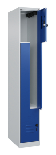 de belangrijkste maten van de C+P garderobekast Classic Plus in één oogopslag:per vak een kledingstang met 3 niet verdraaibare dubbele schuifhaken. openslaande deur met etikettenlijst en ventilatiesleuven. Door de binnenliggende penscharnieren zien de inliggende deuren er strak uit, want aan de buitenkant zijn geen schroeven of scharnieren zichtbaar. Dus de scharnieren doen geen afbreuk aan het design waardoor de hele kast er hoogwaardiger uitziet. Bovendien is het gladde oppervlak gemakkelijker te reinigen, zonder moeilijk bereikbare plaatsen waar vuil of stof zich kan ophopen. Elke deur is standaard uitgerust met een systeem voor gedempte sluiting , zodat de deur niet dichtslaat, zelfs niet wanneer deze een krachtige duw krijgt. Dit draagt niet alleen bij aan een rustigere werkomgeving, maar beschermt de stalen kast ook tegen beschadiging. Geïnspireerd door de natuur levert het BIONIC Steel Frame een bijzonder efficiënte en stabiele constructie op. De torsiestijfheid neemt verder toe door een ingenieuze structuur aan de binnenkant met plooien, steunen en tussenruimten, en door materiaalversterking op belangrijke punten, zoals aan de voorkant van de zijwanden en in de scheidingswand en kokerprofielen. Afsluitbaar met Veiligheidsdraaigrendel voor hangslot. Het veiligheidsslot is uitermate goed bestand tegen inbraak, omdat het doordraait wanneer het is vergrendeld en pas grijpt wanneer het slot is verwijderd. Passend voor alle hangsloten met een beugeldikte van 6 - 8 mm. De extra ventilatieopeningen in het vak, in combinatie met de ventilatiesleuven in de deur, verbeteren de luchtstroom. Dit zorgt voor een goede ventilatie in de kast waardoor de inhoud sneller droogt zonder onaangename geurtjes. De kast staat direct op de vloer, zonder sokkel of poten, voor een compacte en ruimtebesparende look. Alleen stelschroeven zorgen voor een stabiele stand als de vloer eventueel ongelijk is. De bodem van de kast is tevens verzinkt voor een betere bescherming tegen corrosie. constructie van staal, stevig gelast. Dit maakt de constructie zeer robuust en sterk en dus duurzamer. Omdat de hoeken en randen van de romp gelast zijn, is de kast goed afgedicht en dus beter beschermd tegen stof, vocht en vuil dan bij een schroefconstructie. Bovendien is regelmatig onderhoud en nastellen niet nodig. romp met moffellak in RAL7035 lichtgrijs, front met moffellak in RAL5010 gentiaanblauw.