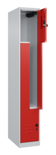 de belangrijkste maten van de C+P garderobekast Classic Plus in één oogopslag:per vak een kledingstang met 3 niet verdraaibare dubbele schuifhaken. openslaande deur met etikettenlijst en ventilatiesleuven. Door de binnenliggende penscharnieren zien de inliggende deuren er strak uit, want aan de buitenkant zijn geen schroeven of scharnieren zichtbaar. Dus de scharnieren doen geen afbreuk aan het design waardoor de hele kast er hoogwaardiger uitziet. Bovendien is het gladde oppervlak gemakkelijker te reinigen, zonder moeilijk bereikbare plaatsen waar vuil of stof zich kan ophopen. Elke deur is standaard uitgerust met een systeem voor gedempte sluiting , zodat de deur niet dichtslaat, zelfs niet wanneer deze een krachtige duw krijgt. Dit draagt niet alleen bij aan een rustigere werkomgeving, maar beschermt de stalen kast ook tegen beschadiging. Geïnspireerd door de natuur levert het BIONIC Steel Frame een bijzonder efficiënte en stabiele constructie op. De torsiestijfheid neemt verder toe door een ingenieuze structuur aan de binnenkant met plooien, steunen en tussenruimten, en door materiaalversterking op belangrijke punten, zoals aan de voorkant van de zijwanden en in de scheidingswand en kokerprofielen. Afsluitbaar met Veiligheidsdraaigrendel voor hangslot. Het veiligheidsslot is uitermate goed bestand tegen inbraak, omdat het doordraait wanneer het is vergrendeld en pas grijpt wanneer het slot is verwijderd. Passend voor alle hangsloten met een beugeldikte van 6 - 8 mm. De extra ventilatieopeningen in het vak, in combinatie met de ventilatiesleuven in de deur, verbeteren de luchtstroom. Dit zorgt voor een goede ventilatie in de kast waardoor de inhoud sneller droogt zonder onaangename geurtjes. De kast staat direct op de vloer, zonder sokkel of poten, voor een compacte en ruimtebesparende look. Alleen stelschroeven zorgen voor een stabiele stand als de vloer eventueel ongelijk is. De bodem van de kast is tevens verzinkt voor een betere bescherming tegen corrosie. constructie van staal, stevig gelast. Dit maakt de constructie zeer robuust en sterk en dus duurzamer. Omdat de hoeken en randen van de romp gelast zijn, is de kast goed afgedicht en dus beter beschermd tegen stof, vocht en vuil dan bij een schroefconstructie. Bovendien is regelmatig onderhoud en nastellen niet nodig. romp met moffellak in RAL7035 lichtgrijs, front met moffellak in RAL3020 verkeersrood.