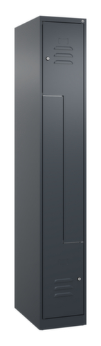 de belangrijkste maten van de C+P garderobekast Classic Plus in één oogopslag:per vak een kledingstang met 3 niet verdraaibare dubbele schuifhaken. openslaande deur met etikettenlijst en ventilatiesleuven. Door de binnenliggende penscharnieren zien de inliggende deuren er strak uit, want aan de buitenkant zijn geen schroeven of scharnieren zichtbaar. Dus de scharnieren doen geen afbreuk aan het design waardoor de hele kast er hoogwaardiger uitziet. Bovendien is het gladde oppervlak gemakkelijker te reinigen, zonder moeilijk bereikbare plaatsen waar vuil of stof zich kan ophopen. Elke deur is standaard uitgerust met een systeem voor gedempte sluiting , zodat de deur niet dichtslaat, zelfs niet wanneer deze een krachtige duw krijgt. Dit draagt niet alleen bij aan een rustigere werkomgeving, maar beschermt de stalen kast ook tegen beschadiging. Geïnspireerd door de natuur levert het BIONIC Steel Frame een bijzonder efficiënte en stabiele constructie op. De torsiestijfheid neemt verder toe door een ingenieuze structuur aan de binnenkant met plooien, steunen en tussenruimten, en door materiaalversterking op belangrijke punten, zoals aan de voorkant van de zijwanden en in de scheidingswand en kokerprofielen. afsluitbaar met cilinderslot. De extra ventilatieopeningen in het vak, in combinatie met de ventilatiesleuven in de deur, verbeteren de luchtstroom. Dit zorgt voor een goede ventilatie in de kast waardoor de inhoud sneller droogt zonder onaangename geurtjes. De kast staat direct op de vloer, zonder sokkel of poten, voor een compacte en ruimtebesparende look. Alleen stelschroeven zorgen voor een stabiele stand als de vloer eventueel ongelijk is. De bodem van de kast is tevens verzinkt voor een betere bescherming tegen corrosie. constructie van staal, stevig gelast. Dit maakt de constructie zeer robuust en sterk en dus duurzamer. Omdat de hoeken en randen van de romp gelast zijn, is de kast goed afgedicht en dus beter beschermd tegen stof, vocht en vuil dan bij een schroefconstructie. Bovendien is regelmatig onderhoud en nastellen niet nodig. romp met moffellak in RAL7016 antracietgrijs, front met moffellak in RAL7016 antracietgrijs.