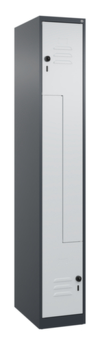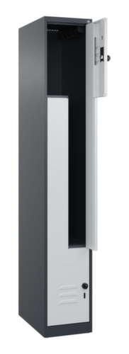 de belangrijkste maten van de C+P garderobekast Classic Plus in één oogopslag:per vak een kledingstang met 3 niet verdraaibare dubbele schuifhaken. openslaande deur met etikettenlijst en ventilatiesleuven. Door de binnenliggende penscharnieren zien de inliggende deuren er strak uit, want aan de buitenkant zijn geen schroeven of scharnieren zichtbaar. Dus de scharnieren doen geen afbreuk aan het design waardoor de hele kast er hoogwaardiger uitziet. Bovendien is het gladde oppervlak gemakkelijker te reinigen, zonder moeilijk bereikbare plaatsen waar vuil of stof zich kan ophopen. Elke deur is standaard uitgerust met een systeem voor gedempte sluiting , zodat de deur niet dichtslaat, zelfs niet wanneer deze een krachtige duw krijgt. Dit draagt niet alleen bij aan een rustigere werkomgeving, maar beschermt de stalen kast ook tegen beschadiging. Geïnspireerd door de natuur levert het BIONIC Steel Frame een bijzonder efficiënte en stabiele constructie op. De torsiestijfheid neemt verder toe door een ingenieuze structuur aan de binnenkant met plooien, steunen en tussenruimten, en door materiaalversterking op belangrijke punten, zoals aan de voorkant van de zijwanden en in de scheidingswand en kokerprofielen. Afsluitbaar met Veiligheidsdraaigrendel voor hangslot. Het veiligheidsslot is uitermate goed bestand tegen inbraak, omdat het doordraait wanneer het is vergrendeld en pas grijpt wanneer het slot is verwijderd. Passend voor alle hangsloten met een beugeldikte van 6 - 8 mm. De extra ventilatieopeningen in het vak, in combinatie met de ventilatiesleuven in de deur, verbeteren de luchtstroom. Dit zorgt voor een goede ventilatie in de kast waardoor de inhoud sneller droogt zonder onaangename geurtjes. De kast staat direct op de vloer, zonder sokkel of poten, voor een compacte en ruimtebesparende look. Alleen stelschroeven zorgen voor een stabiele stand als de vloer eventueel ongelijk is. De bodem van de kast is tevens verzinkt voor een betere bescherming tegen corrosie. constructie van staal, stevig gelast. Dit maakt de constructie zeer robuust en sterk en dus duurzamer. Omdat de hoeken en randen van de romp gelast zijn, is de kast goed afgedicht en dus beter beschermd tegen stof, vocht en vuil dan bij een schroefconstructie. Bovendien is regelmatig onderhoud en nastellen niet nodig. romp met moffellak in RAL7016 antracietgrijs, front met moffellak in RAL7035 lichtgrijs.