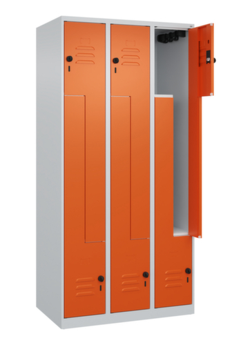 de belangrijkste maten van de C+P garderobekast Classic Plus in één oogopslag:per vak een kledingstang met 3 niet verdraaibare dubbele schuifhaken. openslaande deur met etikettenlijst en ventilatiesleuven. Door de binnenliggende penscharnieren zien de inliggende deuren er strak uit, want aan de buitenkant zijn geen schroeven of scharnieren zichtbaar. Dus de scharnieren doen geen afbreuk aan het design waardoor de hele kast er hoogwaardiger uitziet. Bovendien is het gladde oppervlak gemakkelijker te reinigen, zonder moeilijk bereikbare plaatsen waar vuil of stof zich kan ophopen. Elke deur is standaard uitgerust met een systeem voor gedempte sluiting , zodat de deur niet dichtslaat, zelfs niet wanneer deze een krachtige duw krijgt. Dit draagt niet alleen bij aan een rustigere werkomgeving, maar beschermt de stalen kast ook tegen beschadiging. Geïnspireerd door de natuur levert het BIONIC Steel Frame een bijzonder efficiënte en stabiele constructie op. De torsiestijfheid neemt verder toe door een ingenieuze structuur aan de binnenkant met plooien, steunen en tussenruimten, en door materiaalversterking op belangrijke punten, zoals aan de voorkant van de zijwanden en in de scheidingswand en kokerprofielen. Afsluitbaar met Veiligheidsdraaigrendel voor hangslot. Het veiligheidsslot is uitermate goed bestand tegen inbraak, omdat het doordraait wanneer het is vergrendeld en pas grijpt wanneer het slot is verwijderd. Passend voor alle hangsloten met een beugeldikte van 6 - 8 mm. De extra ventilatieopeningen in het vak, in combinatie met de ventilatiesleuven in de deur, verbeteren de luchtstroom. Dit zorgt voor een goede ventilatie in de kast waardoor de inhoud sneller droogt zonder onaangename geurtjes. De kast staat direct op de vloer, zonder sokkel of poten, voor een compacte en ruimtebesparende look. Alleen stelschroeven zorgen voor een stabiele stand als de vloer eventueel ongelijk is. De bodem van de kast is tevens verzinkt voor een betere bescherming tegen corrosie. constructie van staal, stevig gelast. Dit maakt de constructie zeer robuust en sterk en dus duurzamer. Omdat de hoeken en randen van de romp gelast zijn, is de kast goed afgedicht en dus beter beschermd tegen stof, vocht en vuil dan bij een schroefconstructie. Bovendien is regelmatig onderhoud en nastellen niet nodig. romp met moffellak in RAL7035 lichtgrijs, front met moffellak in RAL2004 zuiver oranje.