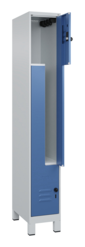de belangrijkste maten van de C+P garderobekast Classic Plus in één oogopslag:per vak een kledingstang met 3 niet verdraaibare dubbele schuifhaken. openslaande deur met etikettenlijst en ventilatiesleuven. Door de binnenliggende penscharnieren zien de inliggende deuren er strak uit, want aan de buitenkant zijn geen schroeven of scharnieren zichtbaar. Dus de scharnieren doen geen afbreuk aan het design waardoor de hele kast er hoogwaardiger uitziet. Bovendien is het gladde oppervlak gemakkelijker te reinigen, zonder moeilijk bereikbare plaatsen waar vuil of stof zich kan ophopen. Elke deur is standaard uitgerust met een systeem voor gedempte sluiting , zodat de deur niet dichtslaat, zelfs niet wanneer deze een krachtige duw krijgt. Dit draagt niet alleen bij aan een rustigere werkomgeving, maar beschermt de stalen kast ook tegen beschadiging. Geïnspireerd door de natuur levert het BIONIC Steel Frame een bijzonder efficiënte en stabiele constructie op. De torsiestijfheid neemt verder toe door een ingenieuze structuur aan de binnenkant met plooien, steunen en tussenruimten, en door materiaalversterking op belangrijke punten, zoals aan de voorkant van de zijwanden en in de scheidingswand en kokerprofielen. Afsluitbaar met Veiligheidsdraaigrendel voor hangslot. Het veiligheidsslot is uitermate goed bestand tegen inbraak, omdat het doordraait wanneer het is vergrendeld en pas grijpt wanneer het slot is verwijderd. Passend voor alle hangsloten met een beugeldikte van 6 - 8 mm. De extra ventilatieopeningen in het vak, in combinatie met de ventilatiesleuven in de deur, verbeteren de luchtstroom. Dit zorgt voor een goede ventilatie in de kast waardoor de inhoud sneller droogt zonder onaangename geurtjes. Door de kunststof voeten onder de kast ziet de kast er niet alleen modern en minder massief uit, maar de voeten bieden ook praktische voordelen. De ruimte onder de kast is gemakkelijker schoon te maken en het kunststof van de voeten biedt een betere bescherming tegen corrosie. Vooral in omgevingen waar hogere eisen aan de hygiëne worden gesteld, is dit een belangrijk aspect. constructie van staal, stevig gelast. Dit maakt de constructie zeer robuust en sterk en dus duurzamer. Omdat de hoeken en randen van de romp gelast zijn, is de kast goed afgedicht en dus beter beschermd tegen stof, vocht en vuil dan bij een schroefconstructie. Bovendien is regelmatig onderhoud en nastellen niet nodig. romp met moffellak in RAL7035 lichtgrijs, front met moffellak in RAL5023 verblauw.